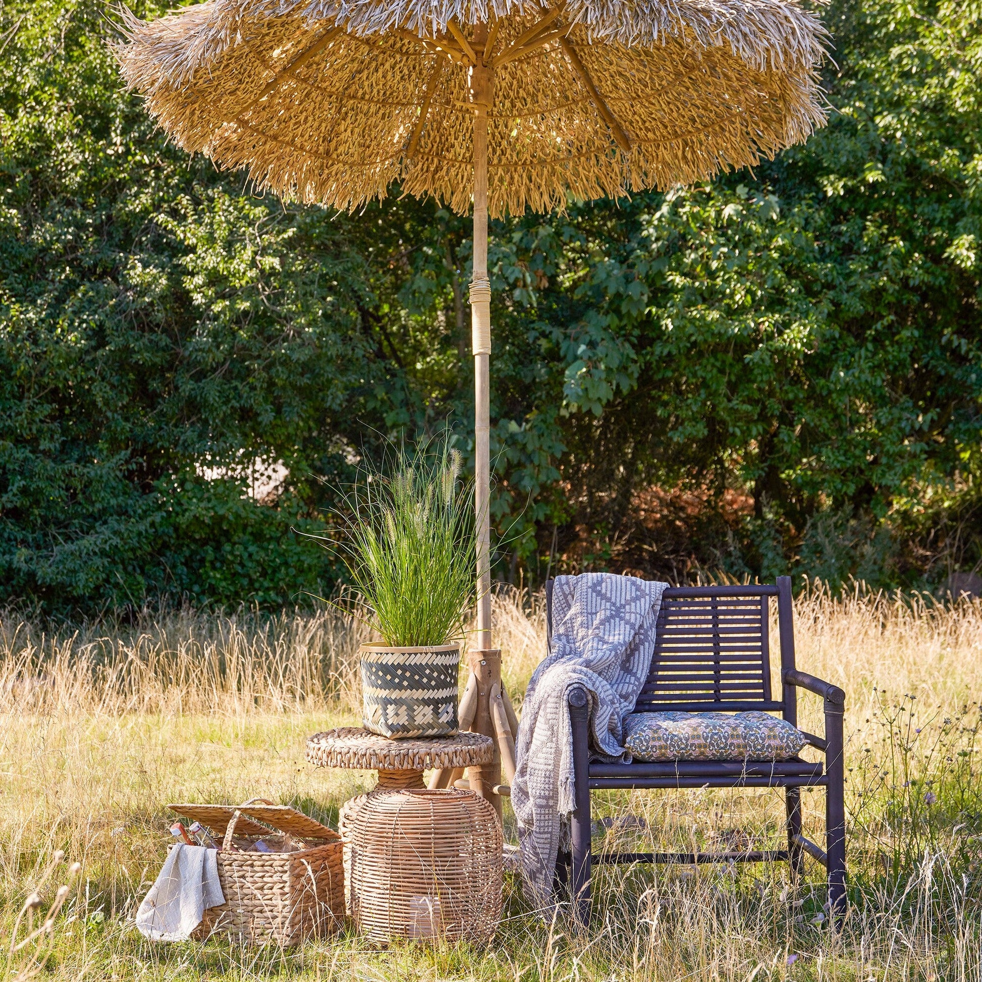 Der Camo Beistelltisch von Bloomingville ist ein Meisterwerk der Einfachheit und des Stils. Entworfen für den Außenbereich, aber auch perfekt geeignet für Wohn- und Schlafzimmer, Büros und elegante Wartezimmer, ist dieser Beistelltisch ein echter Hingucker. Mit seiner Basis aus einem schmalen Zylinder, der sich nach oben hin verjüngt, und der runden Tischplatte, ist er ein perfektes Beispiel für Vintage-Stil. Die Designer haben sich für ein außergewöhnliches Material entschieden: Wasserhyazinthenfasern, die getrocknet und zu einem robusten Gewebe verarbeitet wurden.