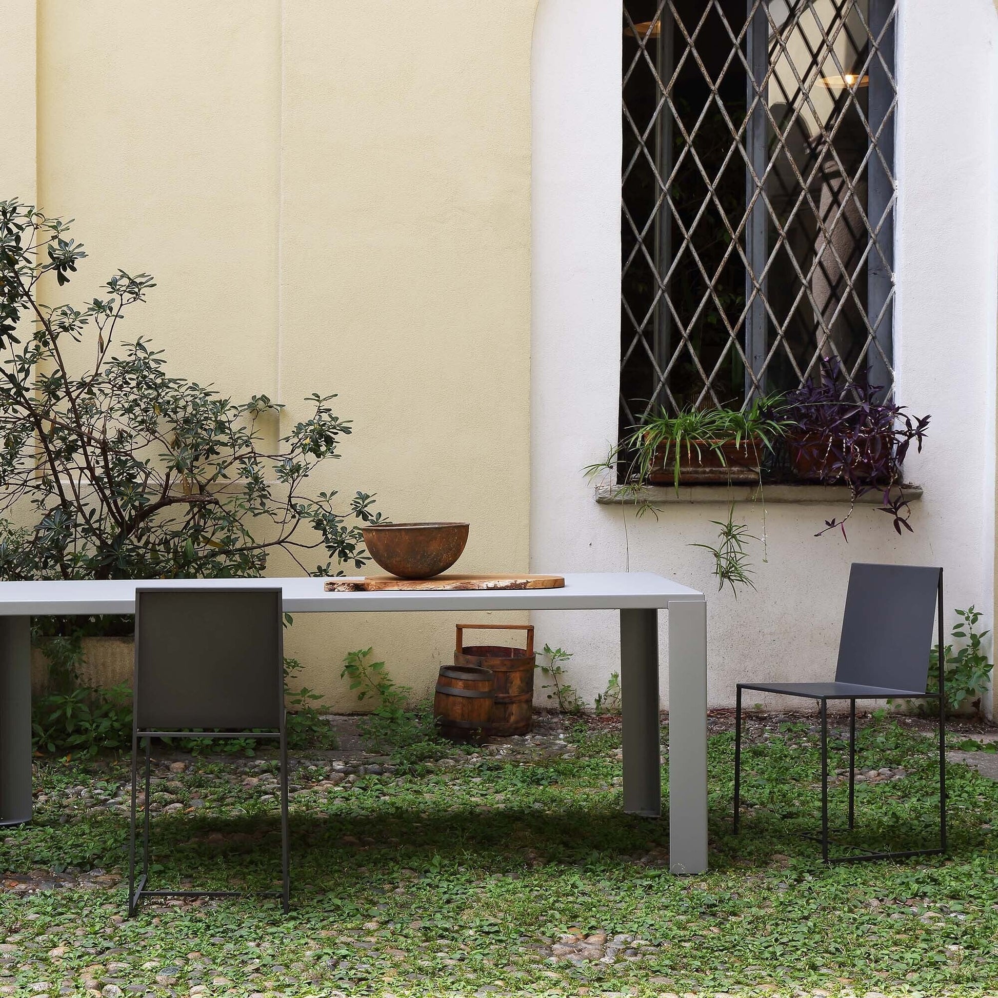Seinen dekorativen Reiz verdankt er einer filigranen Konstruktion aus Vierkantstahl, die von geraden Linien und rechten Winkeln geprägt ist. Die Sitzfläche und Lehne sind aus epoxylackierten Stahlblechplatten gefertigt, die eine sanfte Neigung aufweisen und einen einladenden Charakter zeigen. Gleichzeitig verstärken sie das zarte Gittergestell. Die Beinkufen, die durch einen Querstab verbunden sind, schenken dem Slim Sissi Gartenarmlehnstuhl eine gute Stabilität. Aus recycelten Materialien gefertigt, zeichnet sich das Designstück als nachhaltige Wahl aus.