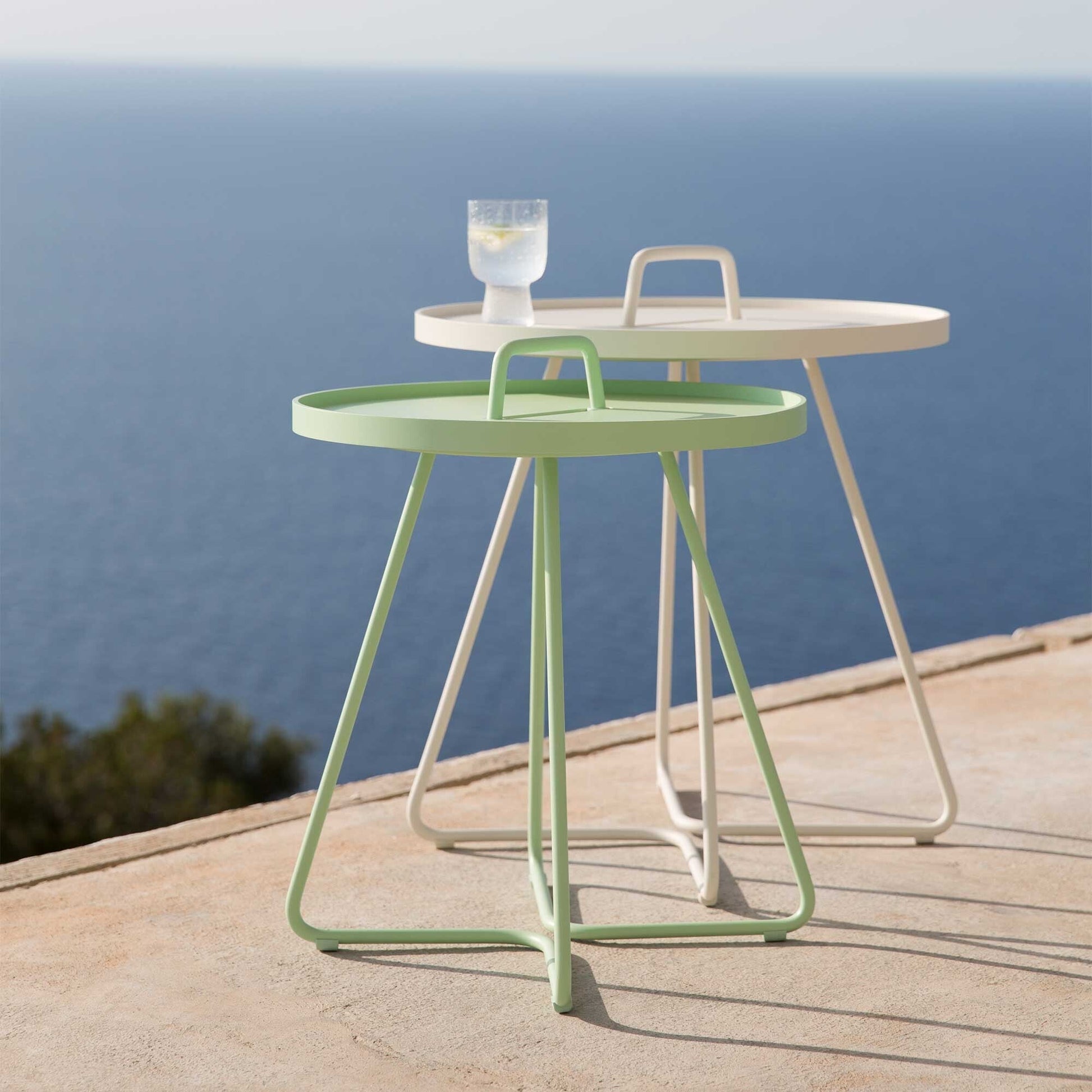 Der On-the-move Beistelltisch L ist nicht nur ein nützliches, sondern auch ein ästhetisches Möbelstück. Seine elegante Form besteht aus einem aus zwei Teilen gefertigten Gestell, das zwei Dreiecke am Boden bildet, um einen stabilen Standfuß zu schaffen. Die Oberseite präsentiert eine runde Tischplatte, ideal für Getränke und Speisen, aber auch für Bücher, Zeitschriften und andere Utensilien. Der Tisch ist aus pulverbeschichtetem Aluminium gefertigt, einem hochwertigen Material, das Wind und Wetter standhält. Daher ist der On-the-move Beistelltisch L auch für den Outdoorbereich perfekt geeignet, ob auf dem Balkon, auf der Terrasse oder neben dem Pool.