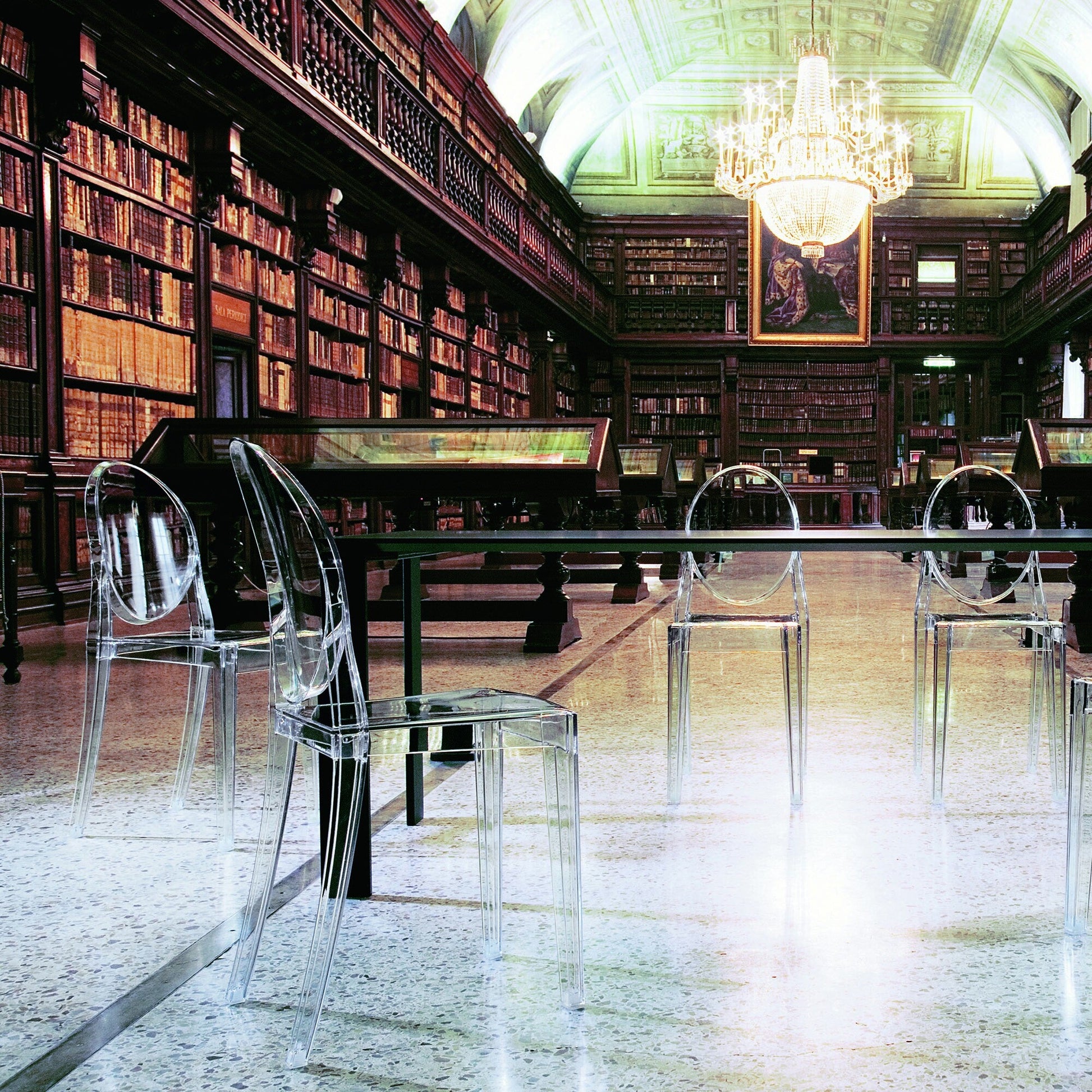 Der Victoria Ghost Stuhl, ein Meisterwerk von Philippe Starck für die italienische Marke Kartell, bringt ein feminines Pendant zum legendären Louis Ghost Stuhl auf den Markt. Diese außergewöhnliche Kollektion besteht aus transparenten Materialien, die den Stuhl wie einen Geist im Raum fast unsichtbar machen.