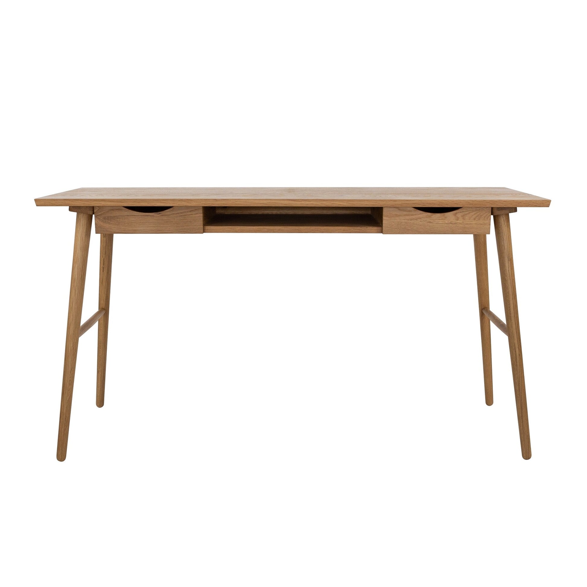Mit seiner langen Platte bietet der Thuis Schreibtisch einen großzügigen Arbeitsbereich, der genügend Platz für einen Laptop, Akten und Schreibsachen bietet. Darunter lassen sich Unterlagen in einem schmalen Fach ablegen oder in den seitlich angebrachten Schubladen vor neugierigen Blicken geschützt verstauen. Die zwei Laden können einfach durch Grifflöcher in den rundlich geschnittenen Aussparungen geöffnet werden.