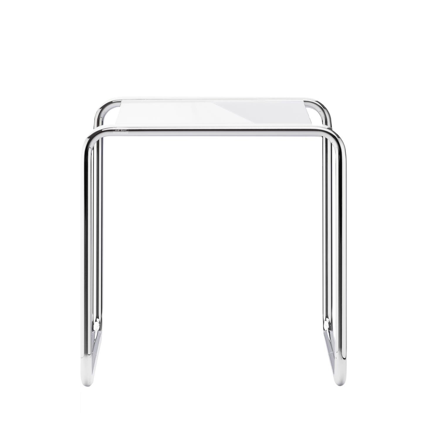 Der Thonet Glastisch B9 besitzt ein Gestell aus verchromtem Stahlrohr und ist mit einer Tischplatte aus transparentem OptiWhite Glas mit Diamantschliff ausgestattet. Der Beistelltisch B 9 ist in den vier Höhen 45cm, 50cm, 55cm und 60cm einzeln erhältlich oder kann gleich im 4er Set von B 9a/b/c/d bestellt werden, das sich ineinander schieben lässt.