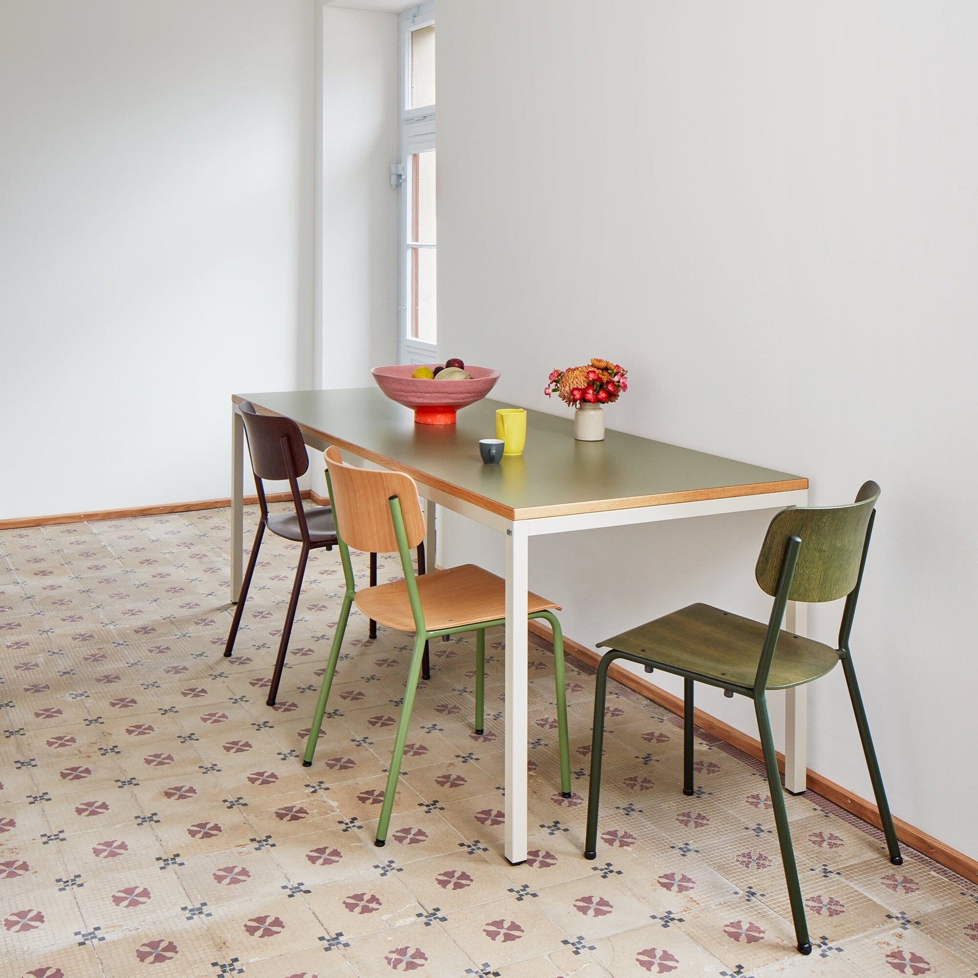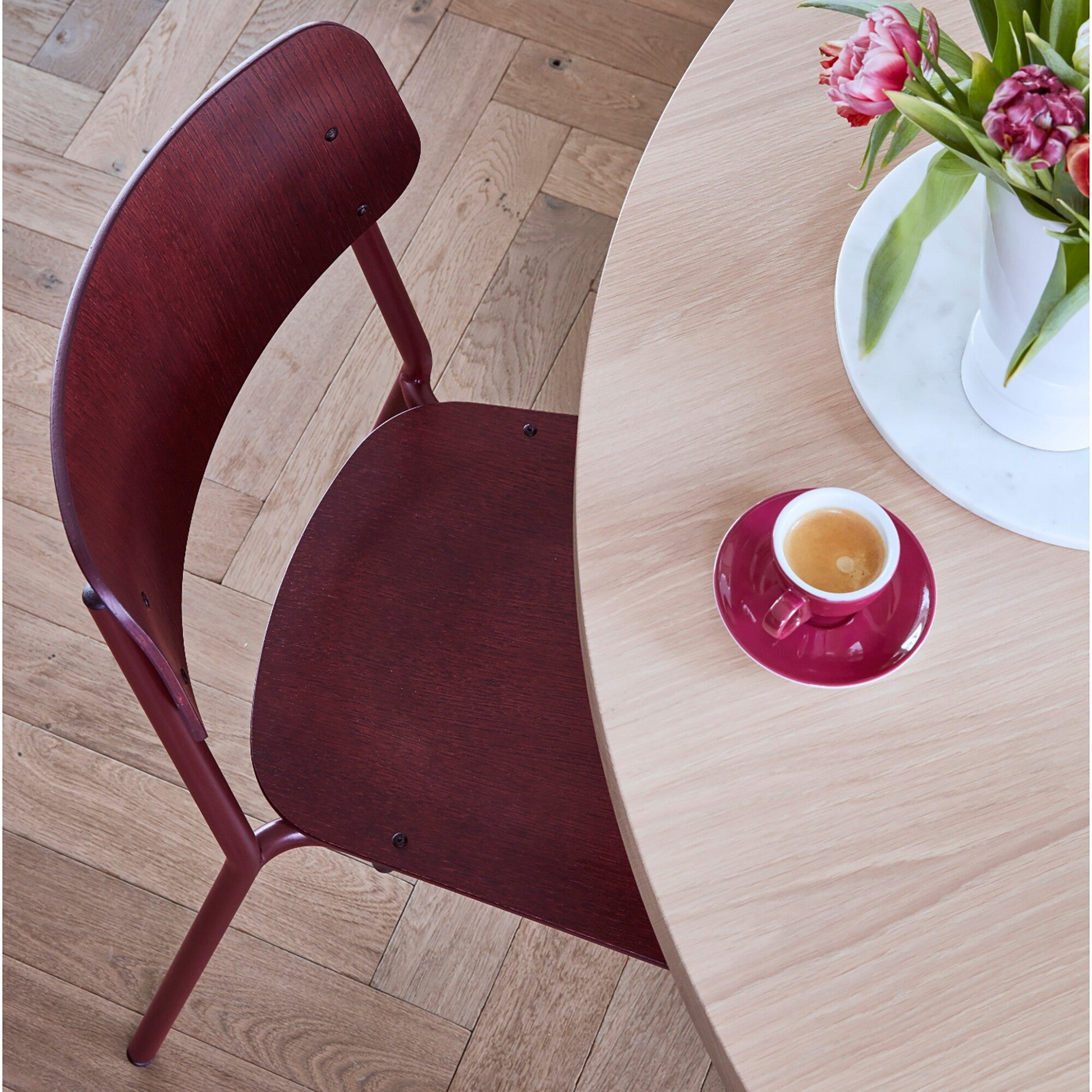 Das Gestell besteht aus pulverbeschichtetem Stahlrohr, das in gleicher Farbe wie die Sitzfläche und die Rückenlehne gehalten wird. Der Stuhl ist in verschiedenen Farben erhältlich, um sich an Ihre individuellen Bedürfnisse anzupassen. Die konkav geformte Rückenlehne bietet perfekte Unterstützung beim Sitzen, während die Sitzfläche mit einer Sitzmulde gestaltet ist. Die harmonisch gerundeten Kanten bestehen aus gebeiztem Eichenholz und verleihen dem Stuhl eine elegante Note.