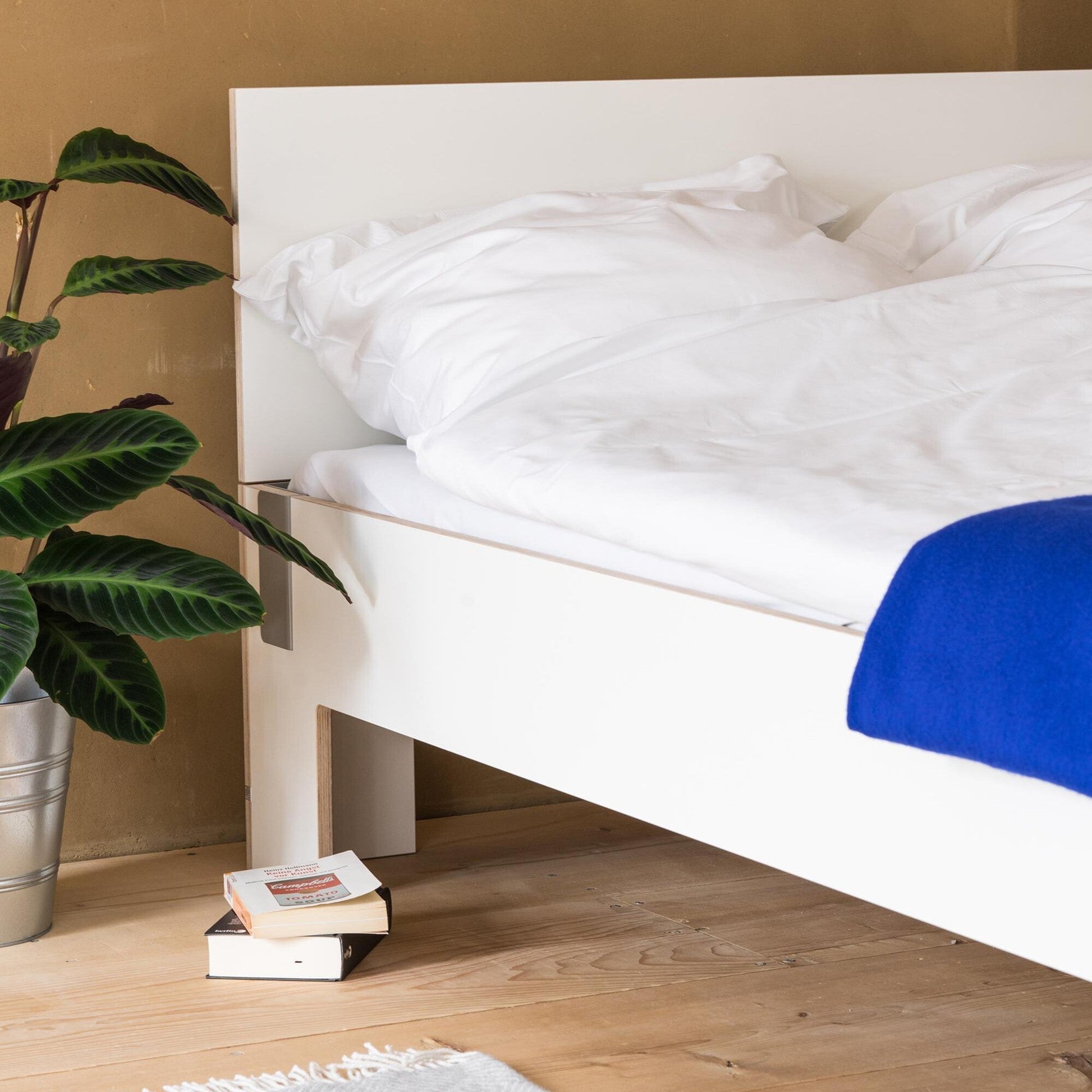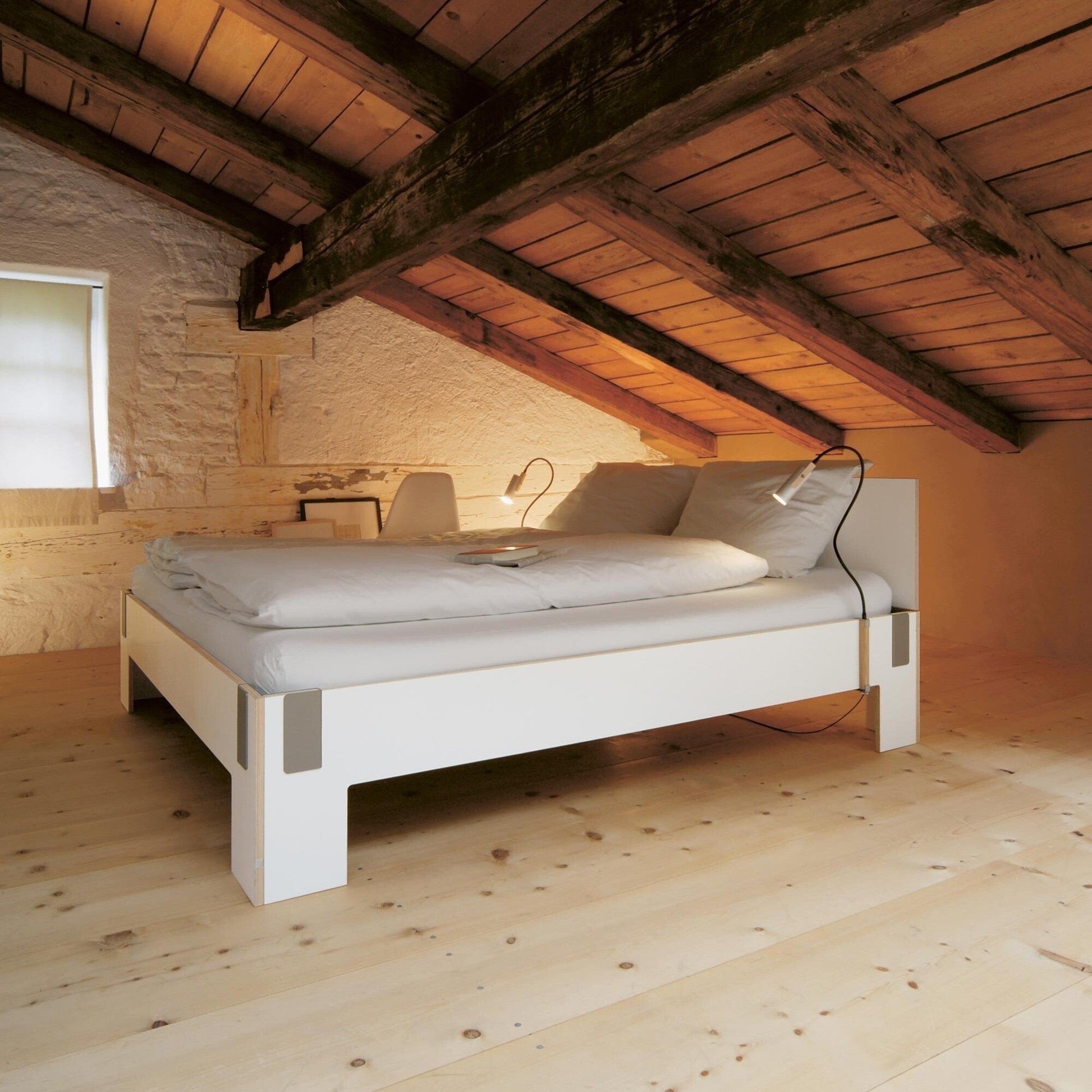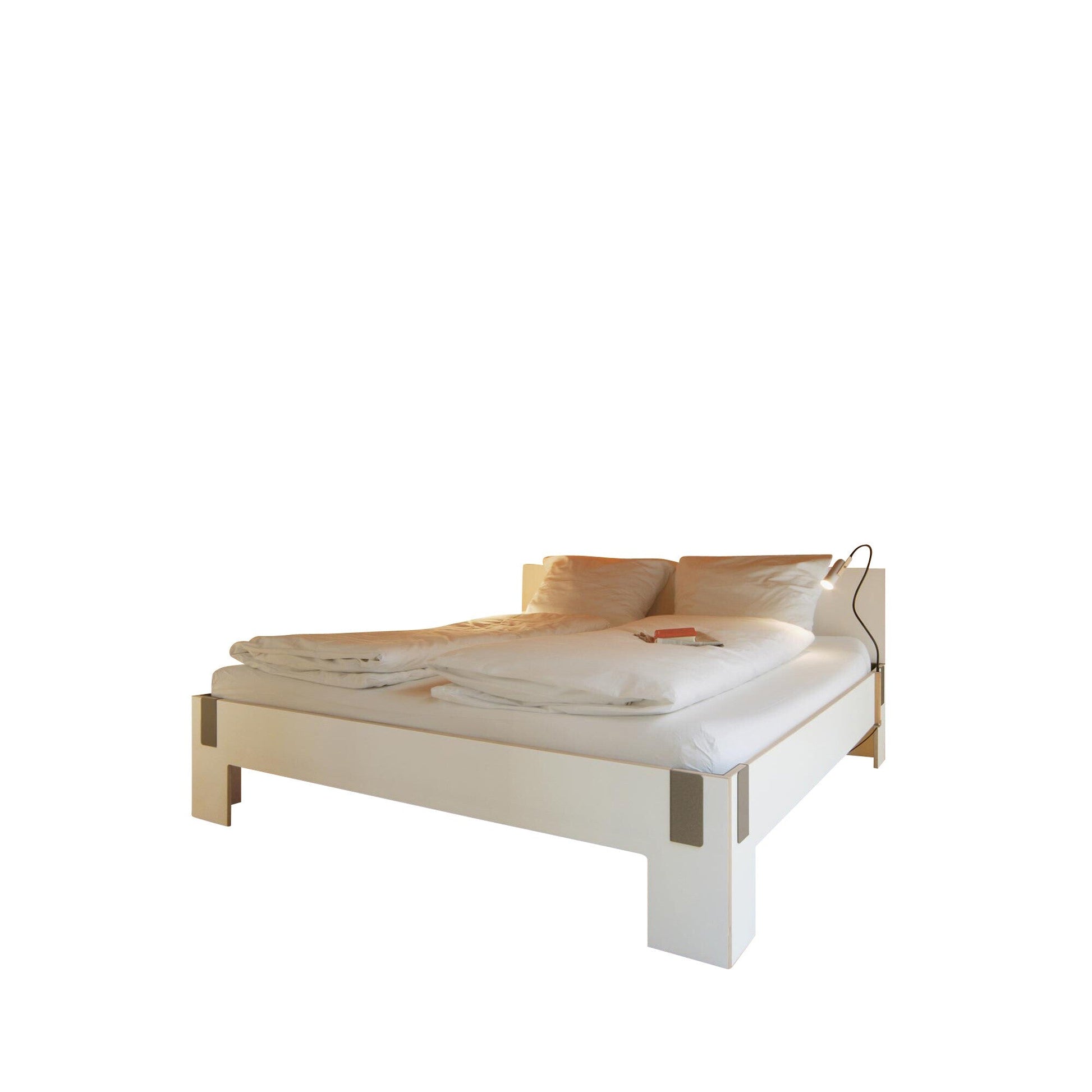 Ausführungen: Moormann Tagedieb Bett mit Kopfteil 180x200cm / weiß/Klammern Stahl gepulvert/LxBxH 213.4x184.7x81.5cm/ohne Matratze und Lattenrost