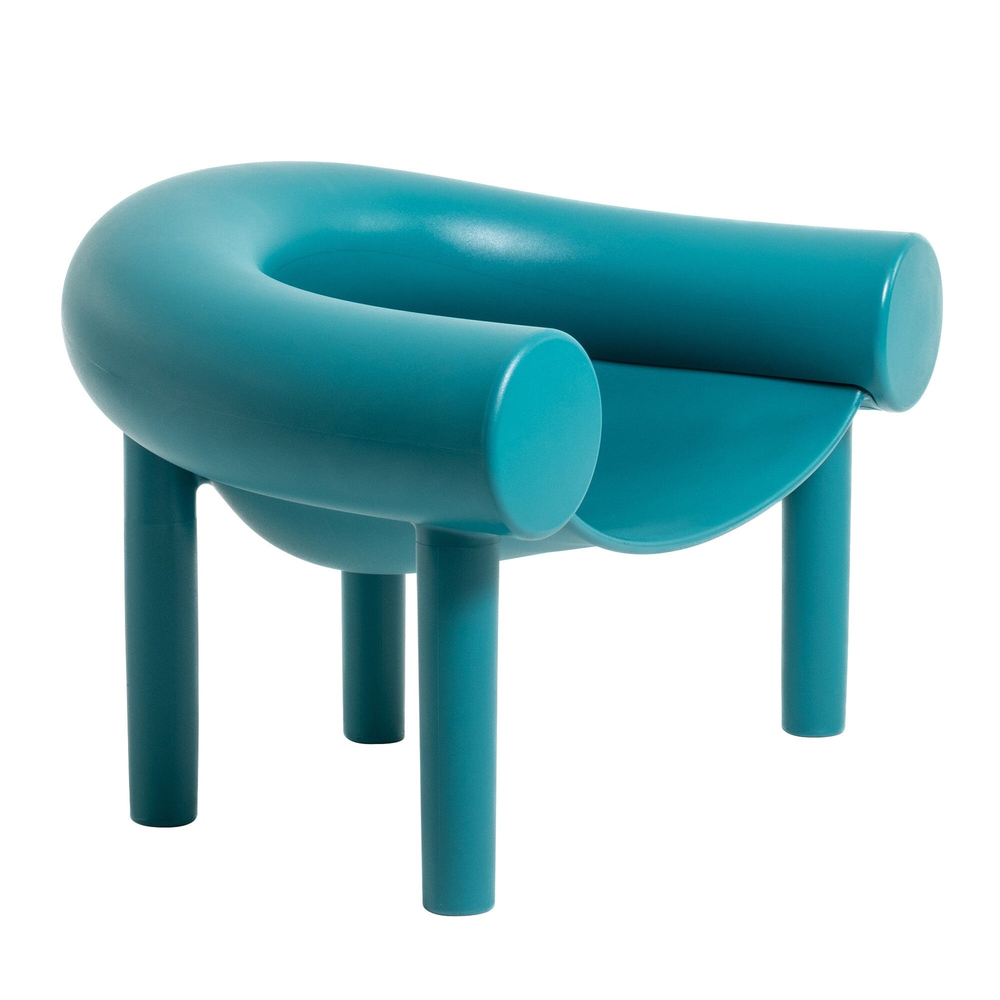Seine einzigartige Formgebung, die an eine Figur aus einem Zeichentrickfilm erinnert, macht ihn zu einem auffälligen Hingucker. Die Rücken- und Armlehnen sind aus einem walzenartigen Stück geformt, das sich um die Sitzschale biegt, während vier zylindrische Stelzenbeine die Sitzmulde tragen. Diese ist tief und bietet einen bequemen Sitz, der leicht nach hinten abfällt.