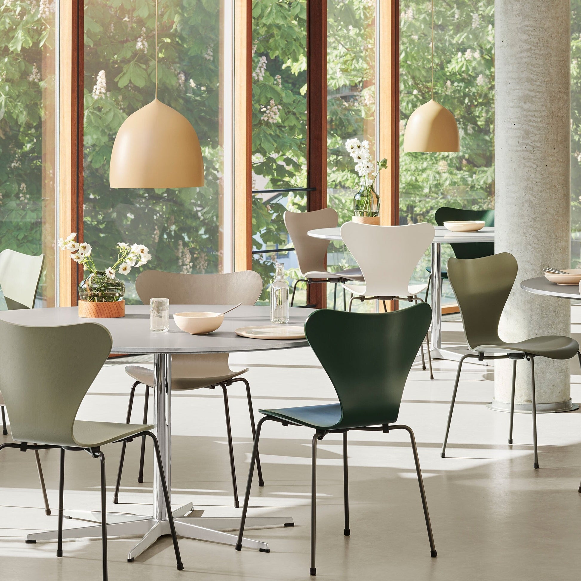 Die in verschiedenen Farben erhältliche Sitzschale ist auf einem filigranen Gestell aus Stahl befestigt, was die Stabilität und den Komfort des Stuhls garantiert. Der Serie 7™ Stuhl gefärbte Esche Gestell Warmes Graphit ist 50 cm breit, 82 cm hoch (mit der Rückenlehne) und 52 cm tief. Mit einer Sitzhöhe von 46 cm passt er zu jedem beliebigen Tisch und bietet sich für jeden Anlass an.