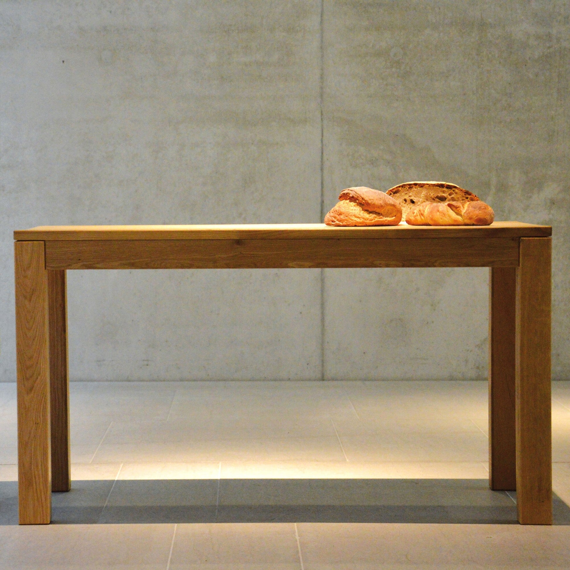 Gefertigt aus geölter Eiche, zeichnet sich der Massivholz-Tisch durch seine robuste Struktur und seine acht Zentimeter starken, stabverleimten Tischbeine aus. Diese ikonische Formgebung unterstreicht das solide Design und verleiht dem Raum eine einzigartige Atmosphäre.