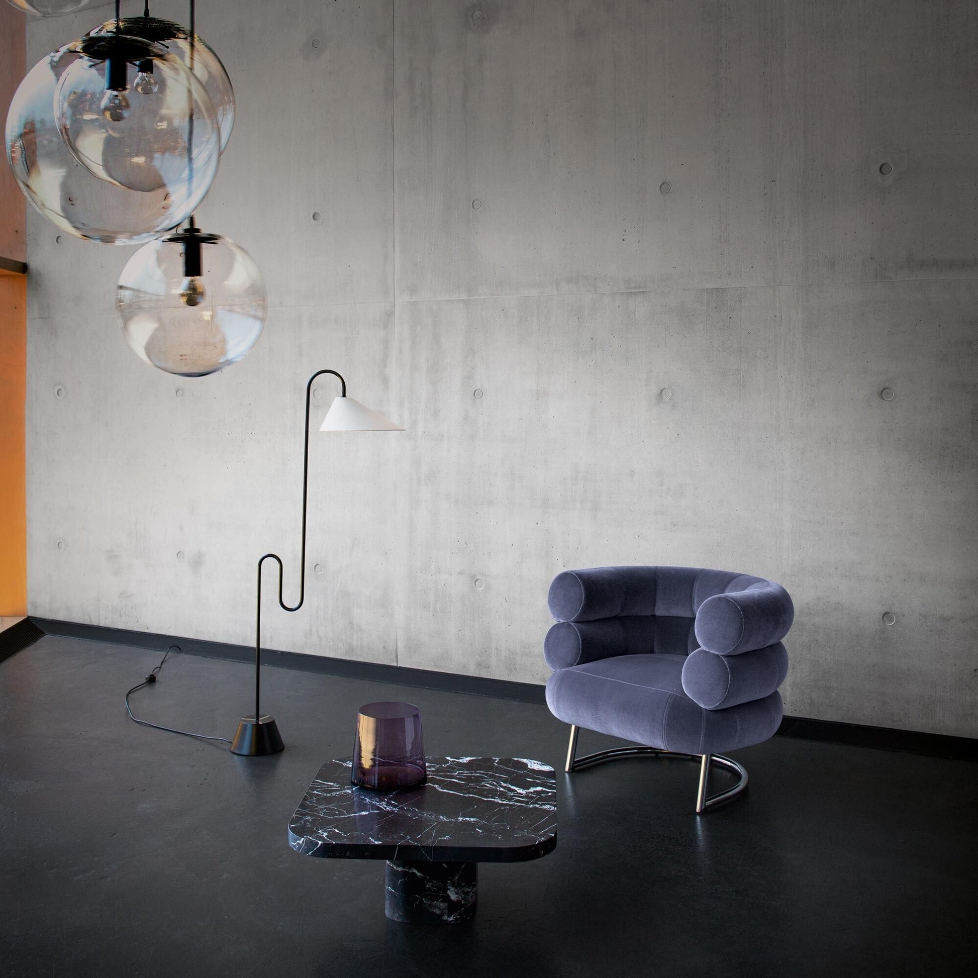 Die Oberfläche des Tisches zitiert futuristische Entwürfe, wirkt aber aufgrund ihrer Materialbeschaffenheit dennoch klassisch. Die abgerundeten Ecken der Tischplatte aus Marmor maßen 70 x 70 cm und schweben auf einem 23 x 23 cm großen Sockel. Die Gesamthöhe liegt bei 31 cm.