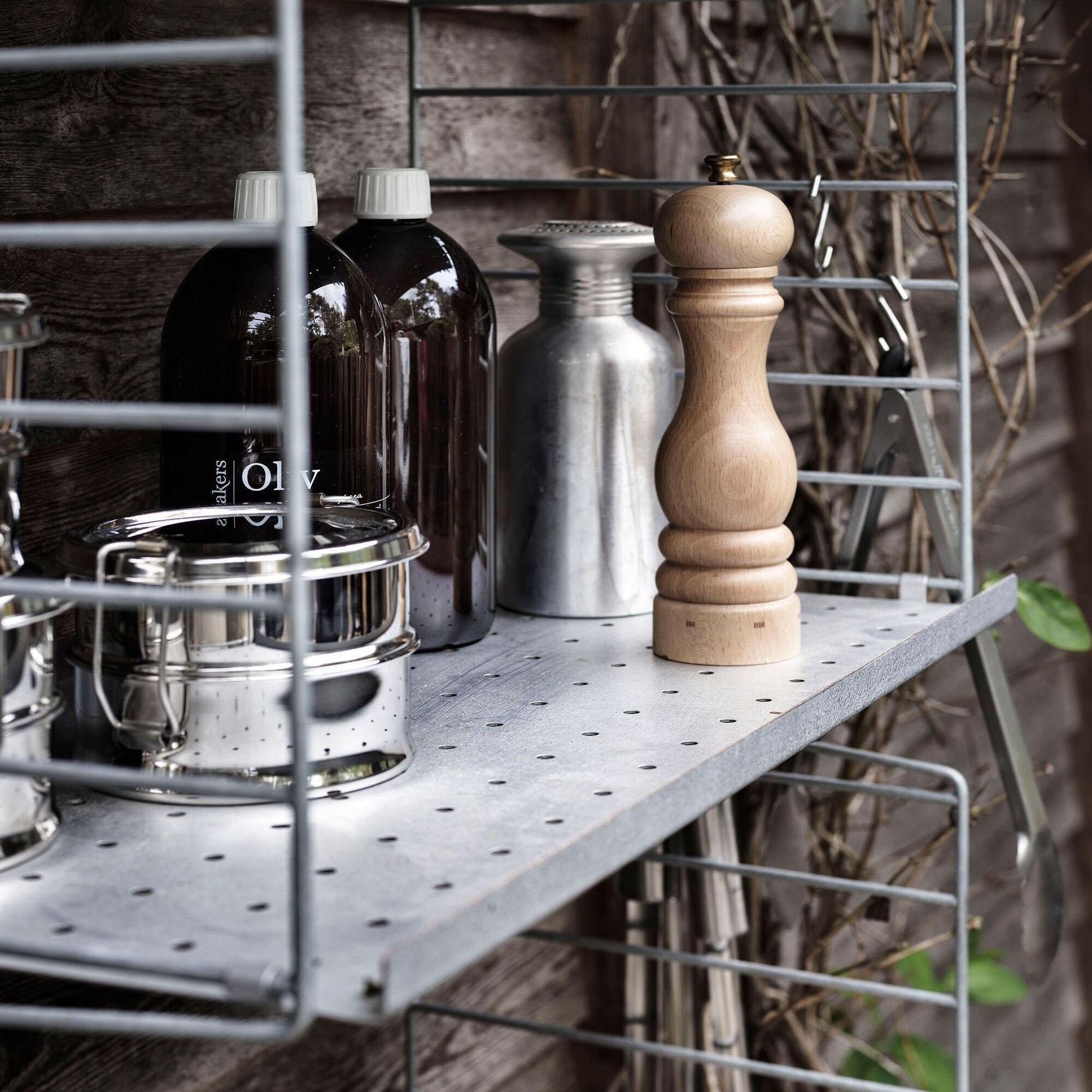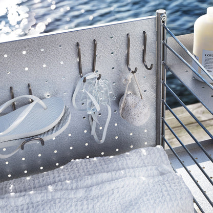 Mit seiner schlanken Abmessung von 58x85x30cm passt das String System Outdoor Standregal in nahezu jede Nische, sei es im Garten, auf dem Balkon oder der Terrasse. Die zwei Metallleitern an der linken und rechten Seite bilden die Basis, auf der eine Rückenwand befestigt ist. Ein Regalbrett mit hohem und eines mit niedrigem Rand sorgt für Ordnung und Struktur. Die Löcher an der Rückwand ermöglichen die Montage von Haken, die unter Zubehör mitbestellt werden können.