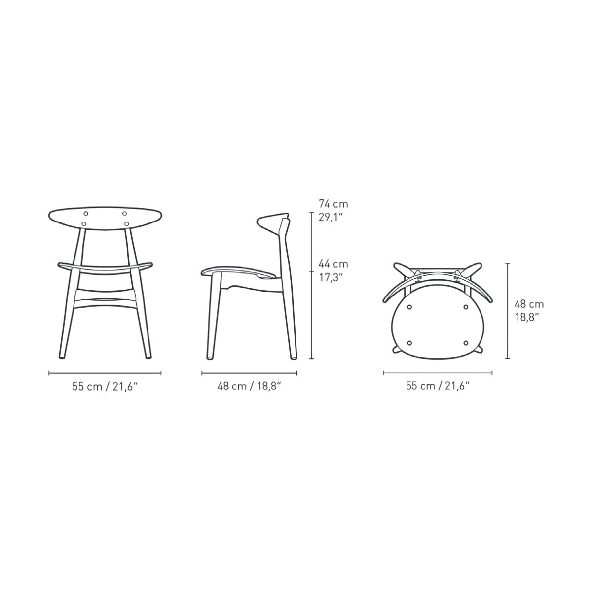 Der CH33T Soft Tones Stuhl misst in der Höhe 74cm bei einer Tiefe von 48cm und einer Sitzhöhe von 44cm. Die Breite beträgt 55cm und das Gewicht 5kg. Der Stuhl ist in verschiedenen Farben verfügbar und bietet eine einzigartige Möglichkeit, Ihre Einrichtung mit einem echten Designklassiker zu verschönern.