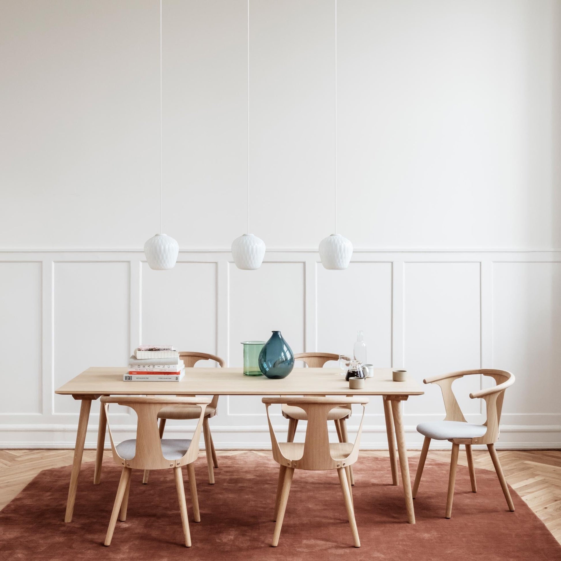 Das Aktionsset In Between Chair SK1 Stuhl + Fell zeichnet sich durch seine Vielseitigkeit aus: Es lädt zum gemütlichen Zusammensein mit der Familie ein und verbreitet eine angenehme Atmosphäre. Der Designer hat sich für das Naturmaterial Holz entschieden, das für seine Dauerhaftigkeit und seine Fähigkeit, sich über die Zeit hinweg zu entwickeln, bekannt ist. Traditionelle Techniken wie Drechseln und Formpressen werden eingesetzt, um der sichelförmigen Rückenlehne und der Sitzfläche ihre markante Form zu geben. Die großen Freiräume in der Rückenlehne tragen zum Markenzeichen des Stuhls bei und geben ihm eine filigrane Silhouette. Die runden und hinten weit ausgestellten Beine tragen zum harmonischen Gesamtbild bei.