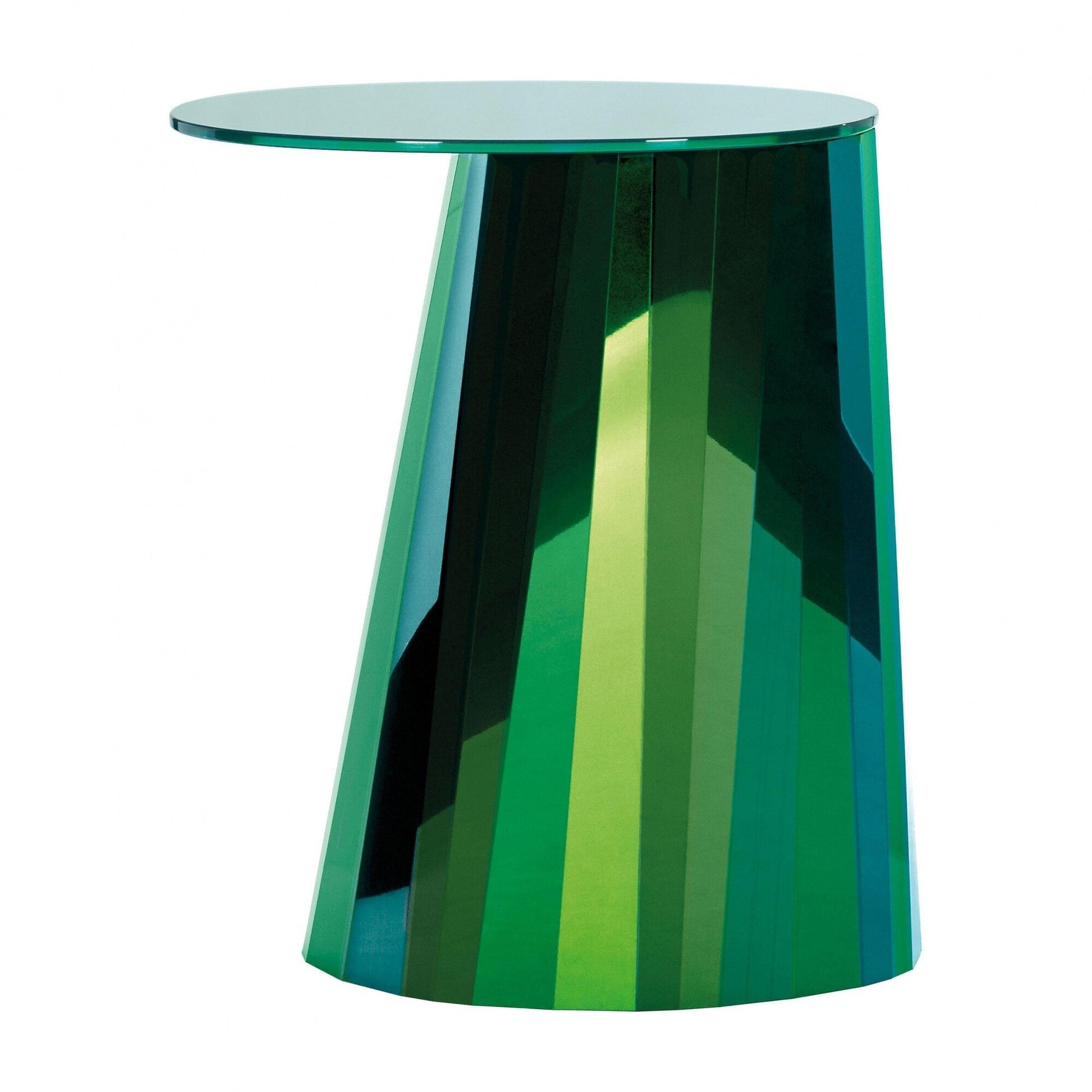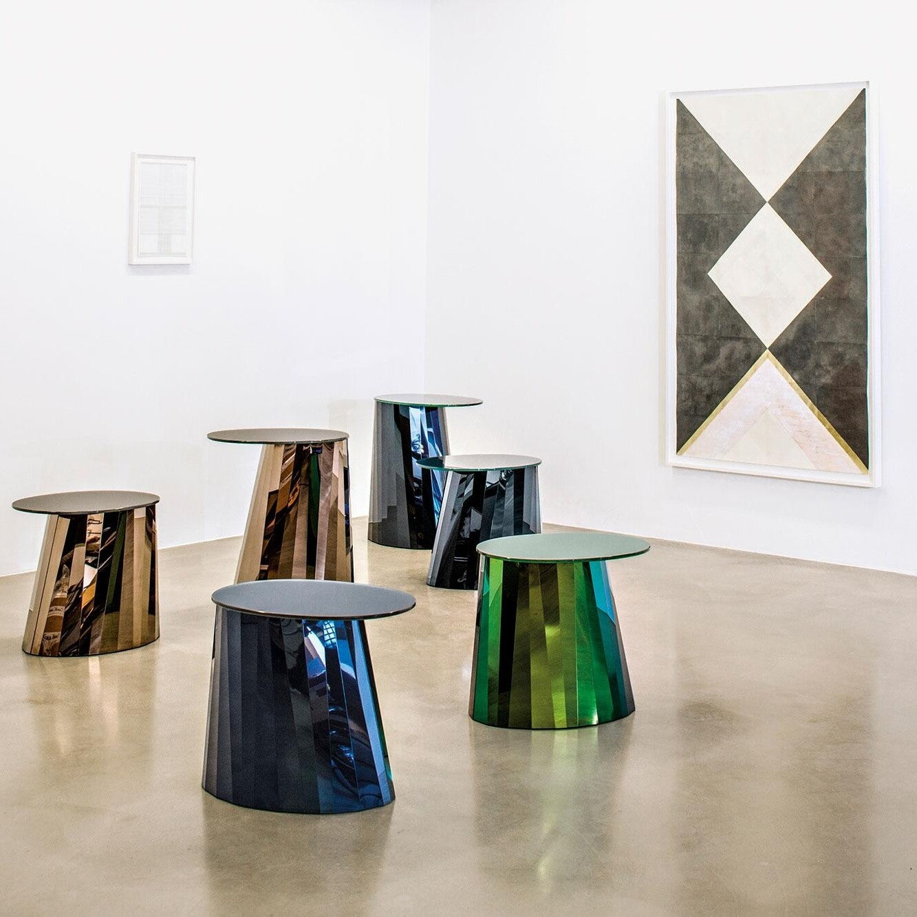 Ausführungen: Pli Beistelltisch hoch / topas-grün/Kristallglas 53x42cm/H 65cm/Filzgleiter schwarz/Gestell Edelstahlblech glänzend Ø47cm