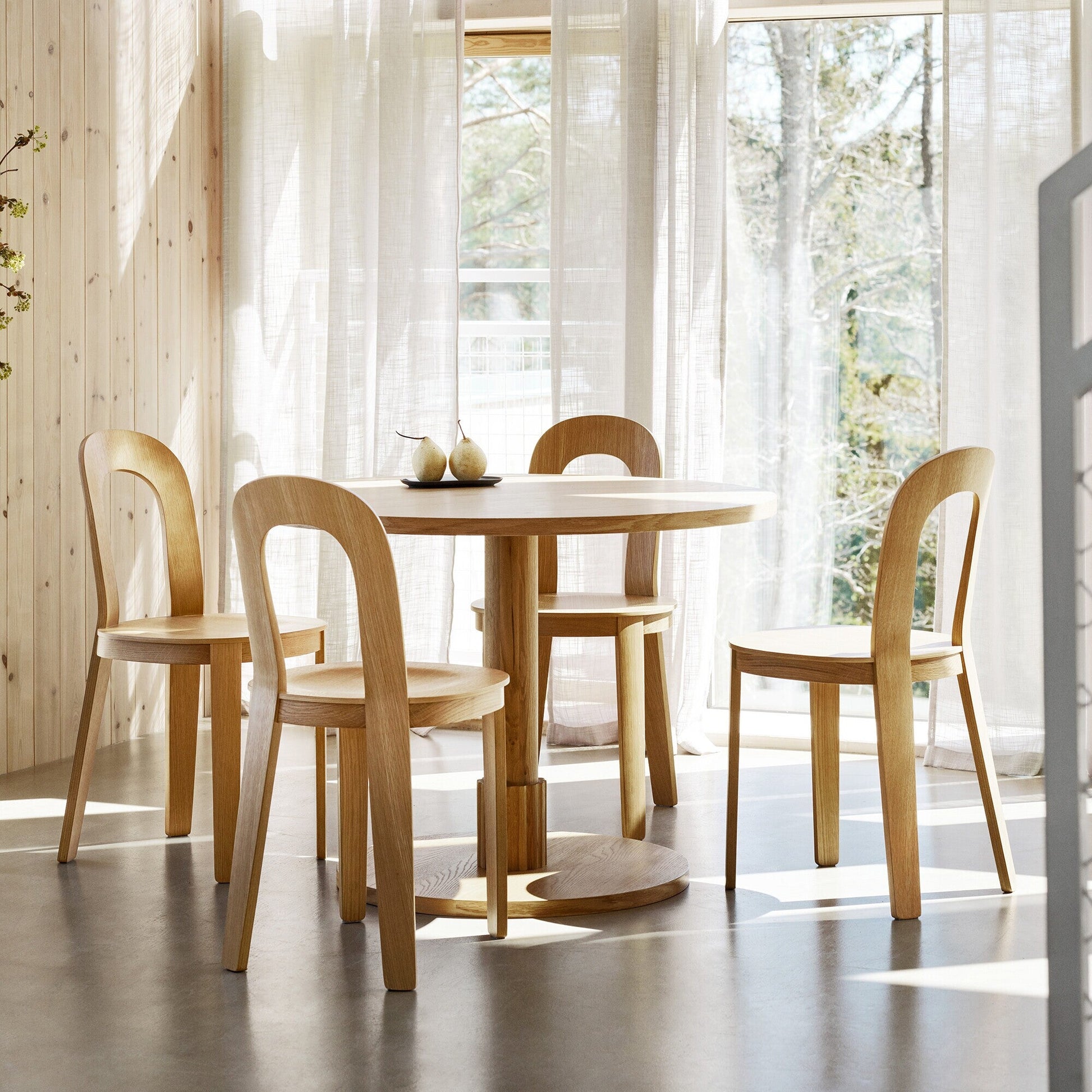 Material: Rückenlehne: Eichenfurnier, Verstärkung des unteren Sitzrahmens: Gummibaum, Beine und Sitz: Eiche (Herkunft: Europa)