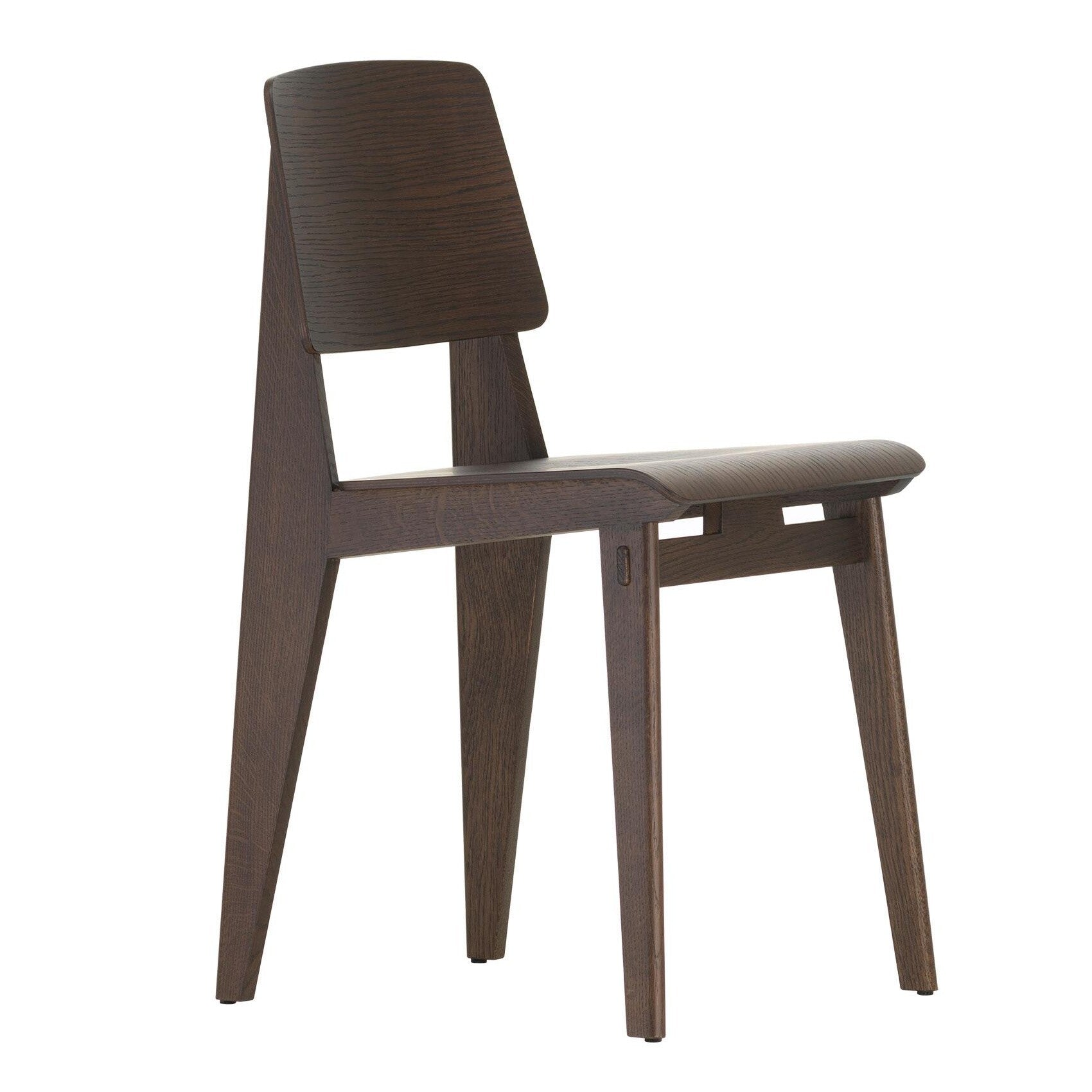Der 46 cm breite und 80,5 cm hohe Chaise Tout Bois Stuhl mit einer Sitzhöhe von 46 cm ist aus massivem Eichenholz gefertigt. Prouvés Design basierte auf den Erkenntnissen der menschlichen Anatomie, weshalb das Gestell an den Seiten verstärkt wurde, um den Druck an der Höhe zwischen Rückenlehne und Sitzfläche zu minimieren.