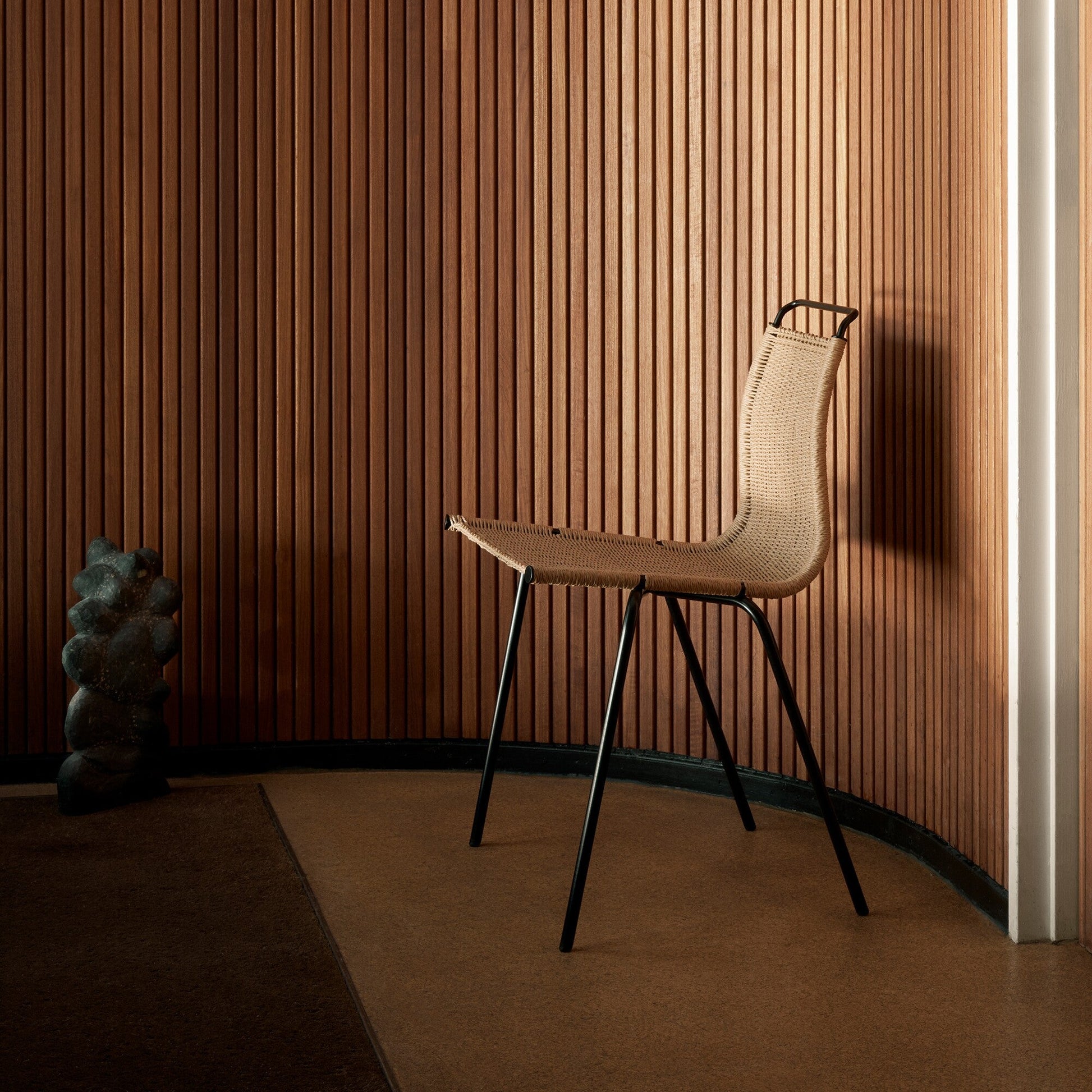 Bei dem PK1 Stuhl setzt der Designer auf eine interessante Kombination von Materialien. Das Gestell, das in verschiedenen Farben gehalten wird, besteht aus pulverbeschichtetem Stahl oder Edelstahl und wird durch leicht ausgestellte Beine gekennzeichnet. Im Kontrast dazu präsentiert sich die Sitzfläche direkt in die leicht gerundete und dadurch besonders bequeme Rückenlehne übergehend. Die Stuhlbespannung ist aus Papierkordel in Handarbeit geflochten und bietet im Vergleich zum Stahl eine pure Leichtigkeit.