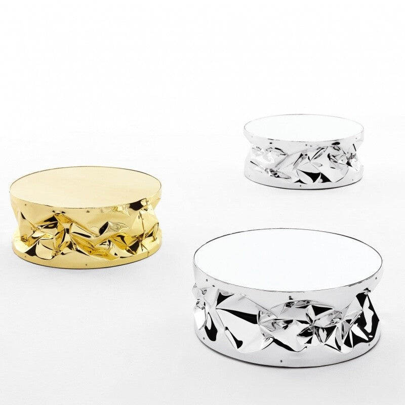 Mit seinem runden Design und verspiegelten Oberfläche aus Spiegelglas bildet der Tab.Ulino Beistelltisch einen interessanten Kontrast zum unregelmäßig gestalteten Korpus, der aus Aluminium besteht und bei der Herstellung per Hand zerknittert wird. Eine innere Struktur aus Sperrholz sorgt für Standfestigkeit, während versteckte Rollen an der Unterseite den Beistelltisch leicht zu verschieben machen.
