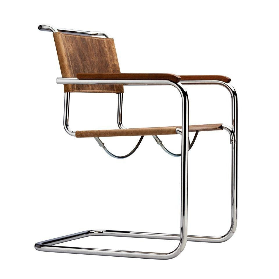Ausführungen: S 34 Pure Materials Freischwinger Armlehnstuhl / Büffelleder braun/Armlehne Nussbaum geölt/BxHxT 57x84x64cm/Gestell Stahlrohr vechromt