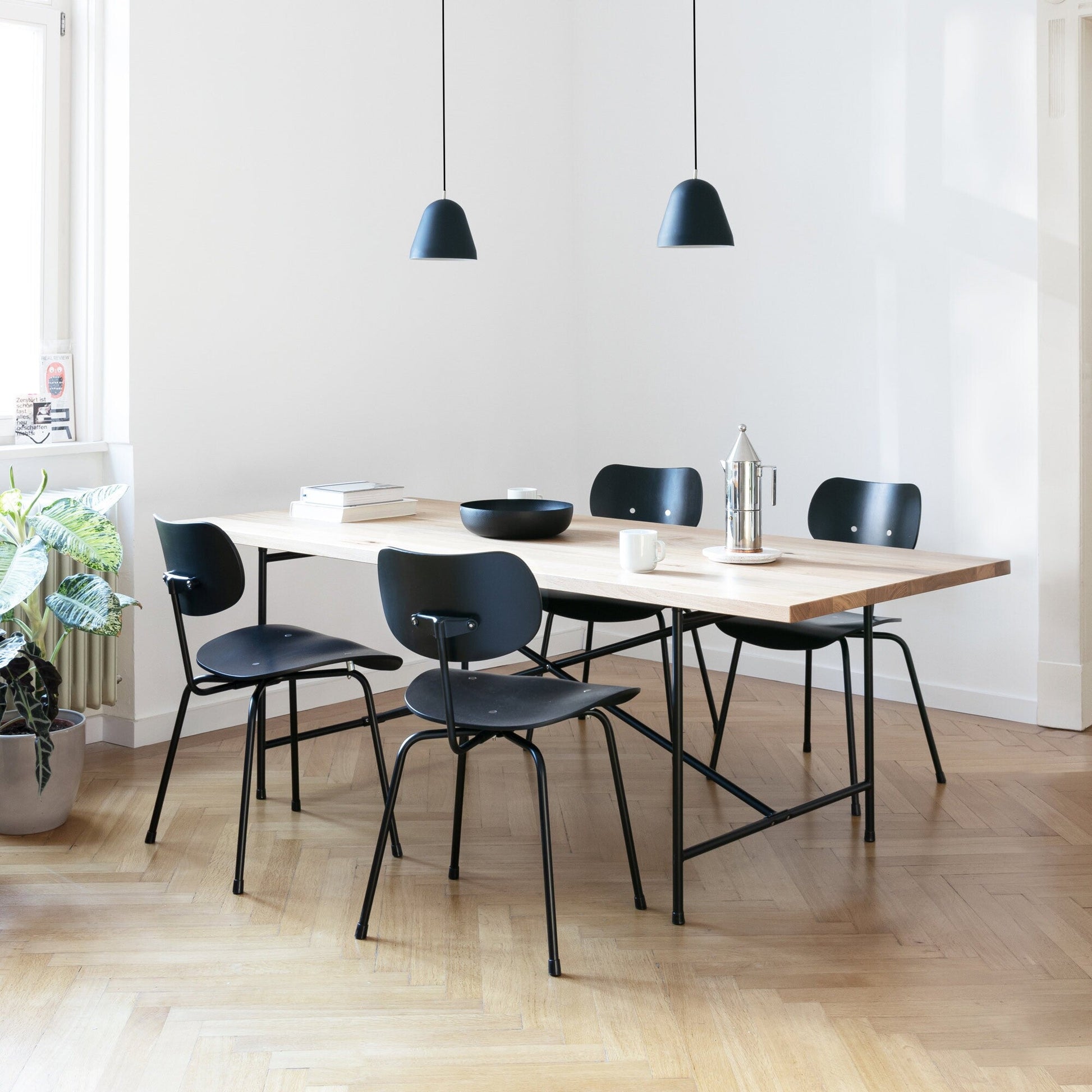 Der Eiermann Stuhl SE 68 Gestell Schwarz ist eine Ikone der deutschen Nachkriegsmoderne, die seit 1951 von Egon Eiermann für die Marke Wilde + Spieth entworfen wurde. Trotz seines großen Alters bleibt der Stuhl aktuell und unvergleichlich. Seine einzigartige organisch geformte Sitzfläche war für die damalige Zeit ein Meilenstein, da sie dem Anspruch Eiermanns gerecht wurde, der Sitzgelegenheit "menschliches Maß" zu geben. Die vier Beine, leicht nach außen geneigt, sorgen für einen sicheren Halt auf jedem Untergrund, während die am Ende montierten Fußgleiter verhindern, dass die formschöne Sitzgelegenheit ins Rutschen gerät.
