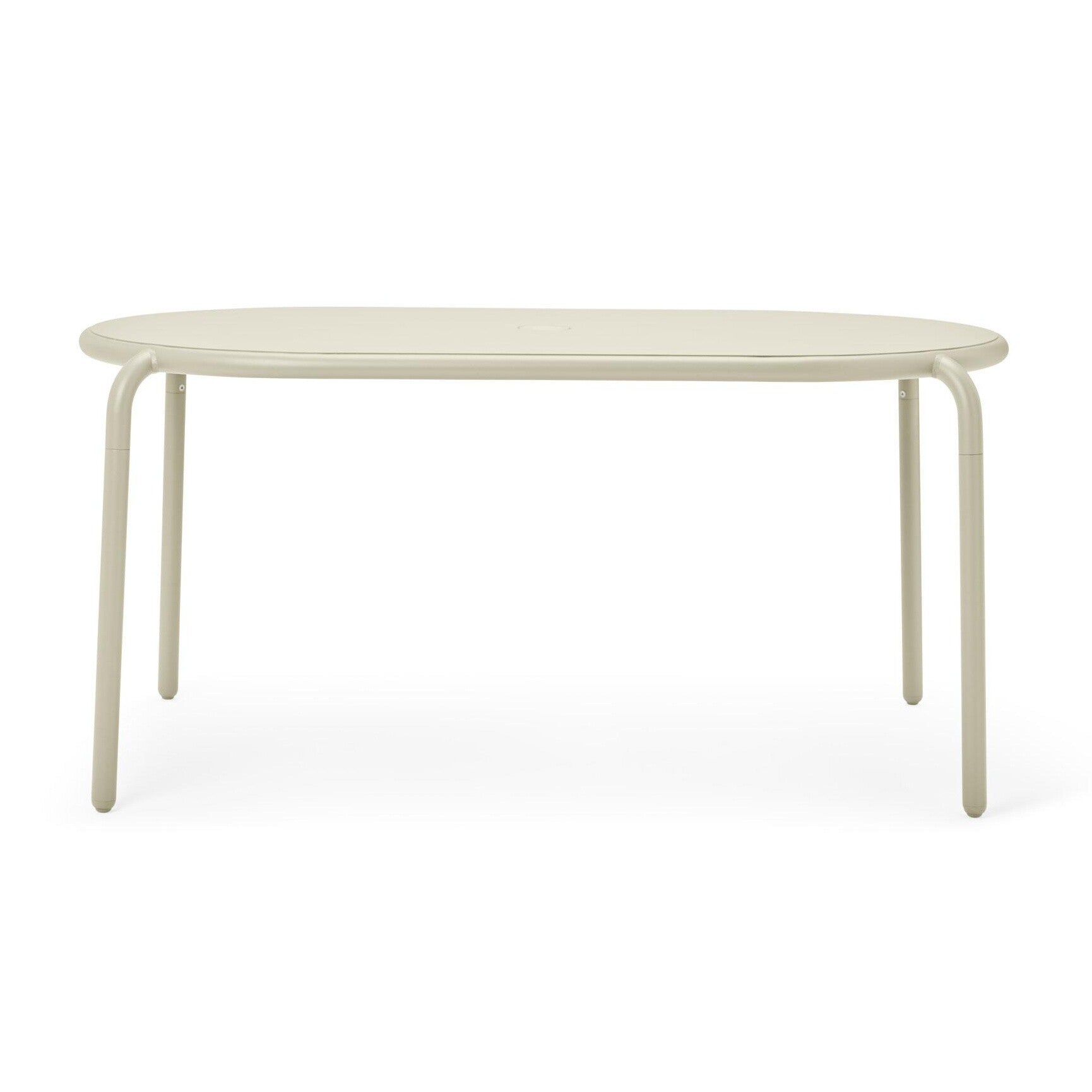 Dank seiner vielfältigen Farbpalette ist es leicht, ihn in die bestehenden Dekorationskonzepte zu integrieren. Die sanft gerundeten Ecken und die vier Tischbeine, die einen Bogen beschreiben, sorgen für maximale Beinfreiheit und eine einzigartige, harmonische Gesamterscheinung. Die runde Aussparung in der Tischplatte mit einem Durchmesser von 41 mm bietet genügend Platz für einen Sonnenschirm oder einen Kerzenständer aus derselben Kollektion.