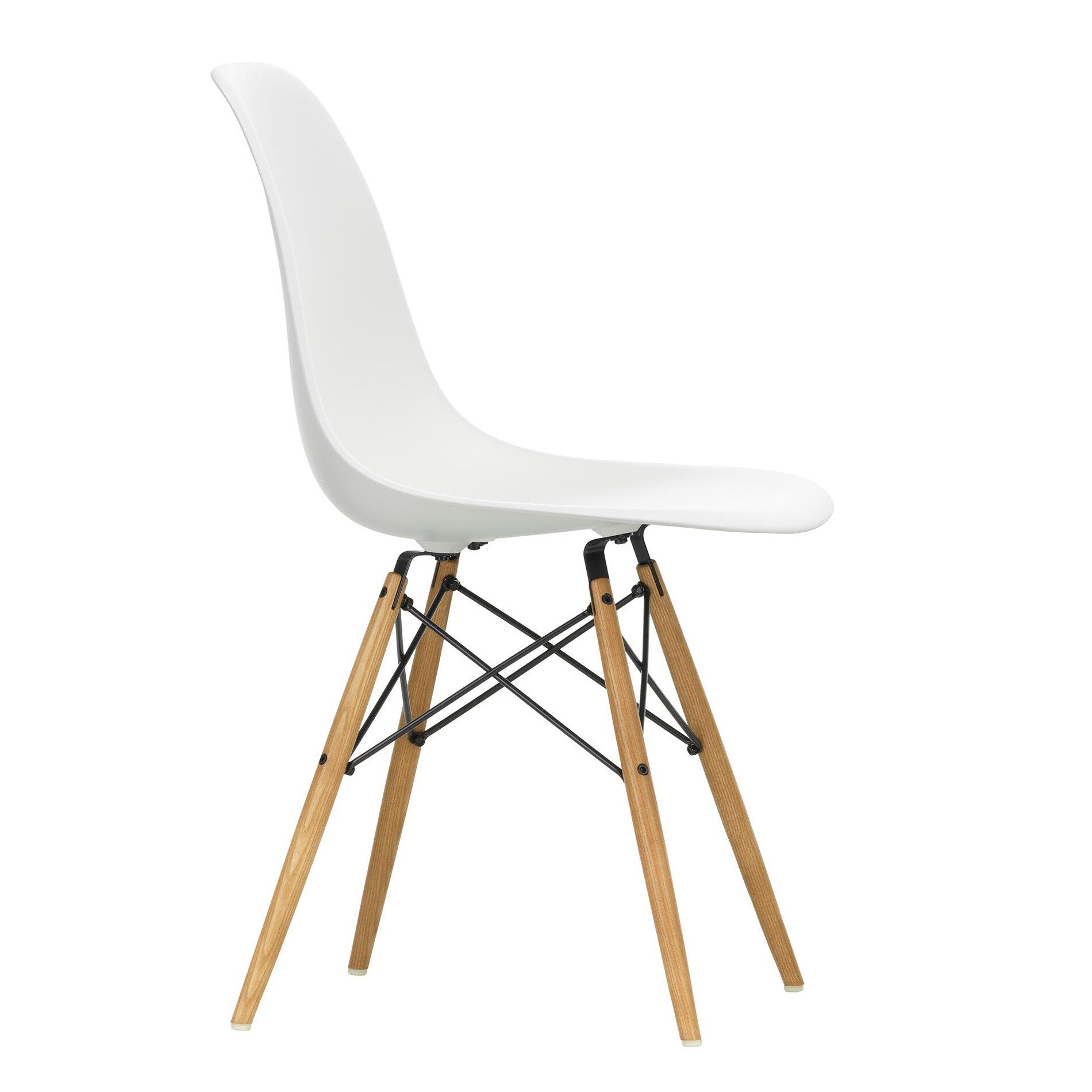 Ausführungen: Eames Plastic Side Chair DSW Gestell Esche / weiß/Sitzschale Polypropylen/Gestell Esche honigfarben/Stahl schwarz/BxHxT 46,5x83x55cm