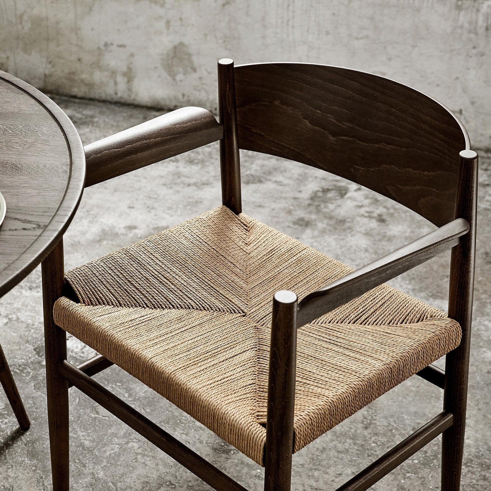 Das Gestell besteht aus edlem, FSC-zertifiziertem Buchen- oder Eichenholz, das aus nachhaltiger Forstwirtschaft stammt. Die vier runden Beine gehen ohne sichtbaren Übergang in die Armlehnen über, was dem Stuhl eine klare Linienführung verleiht. Die leicht gebogene Rückenlehne bietet dem Körper auch bei längerem Verweilen eine gute Stütze. Ein ansprechender Kontrast zum minimalistischen Gestell bildet der Sitzpolster, der aus Papiergeflecht gefertigt ist.