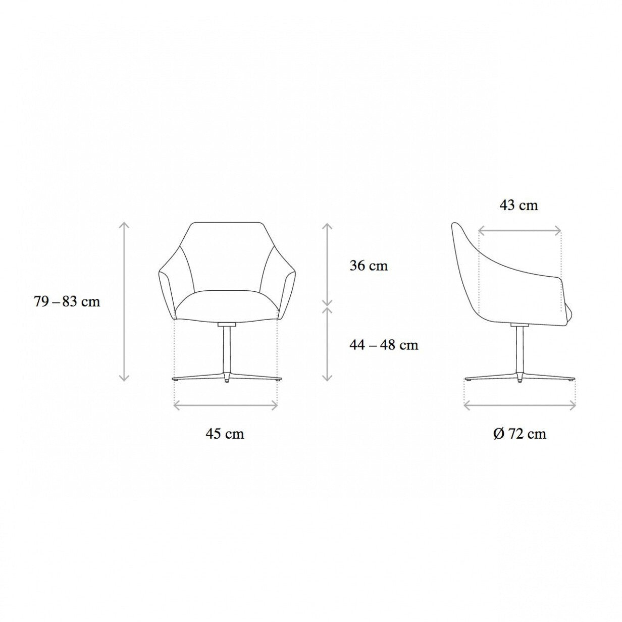 Abmessungen: Breite: 72cmHöhe: 83cmTiefe: 72cmSitzhöhe: 48cmHöhe Rückenlehne: 88cm