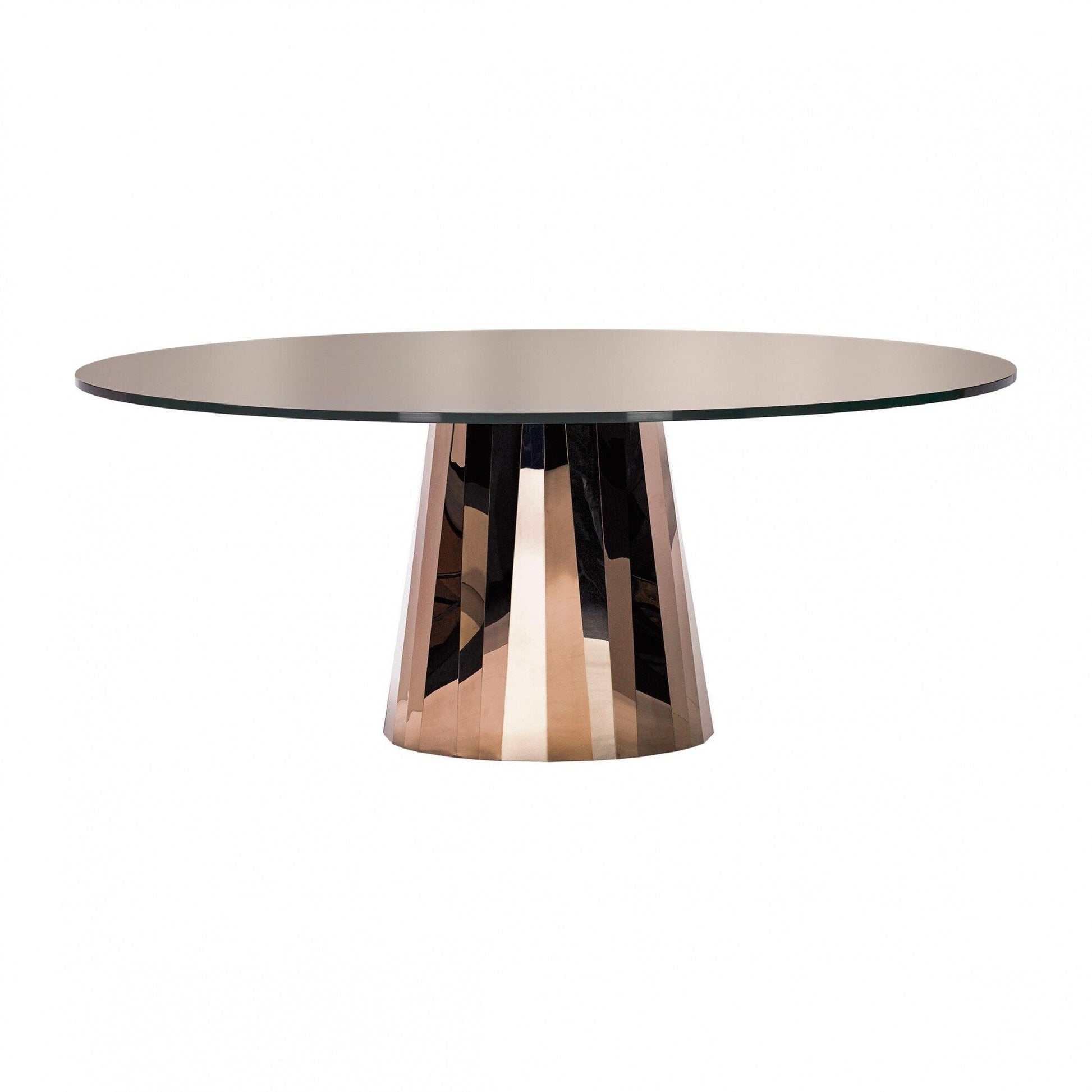 Der Pli Esstisch zeichnet sich durch seine Eleganz aus, die durch den Standfuß in Form von Edelstahlblech noch unterstrichen wird. Der Fuß ist mit unzähligen Knicke gelegt, was den Eindruck erzeugt, als ob es sich um einen überdimensionalen Edelstein handelt. Wenn das Licht oder ein Sonnenstrahl auf den Fuß fällt, fängt er in verschiedenen Farben zu schillern an. Die ovale Tischplatte besteht aus Kristallglas und ist in verschiedenen Farben erhältlich.