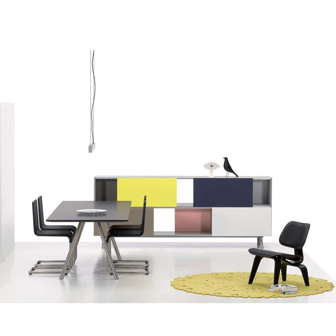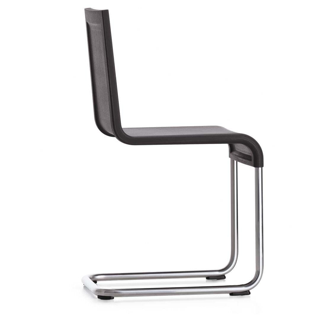 Das Designstück verbindet eine Schale aus Integralschaum mit einem Edelstahl-Rohrrahmen zu einem komfortablen Sitzmöbel, das auf jede Belastung mit einem leichten Einsink-Effekt reagiert. Die hohe Flexibilität von Sitz und Unterbau sorgt für ein bequemes Sitzgefühl, während die robuste und langlebige Standfähigkeit des Stuhls ihn ideal für den Alltagsgebrauch macht. Der Rücken des Stuhls verfügt über integrierte Blattfedern, die ein sanftes Wippen ermöglichen, und die Unterseite des Rahmengestells ist mit festen Gleitern ausgestattet, was den Designstuhl auch auf Teppichböden einsetzbar macht.
