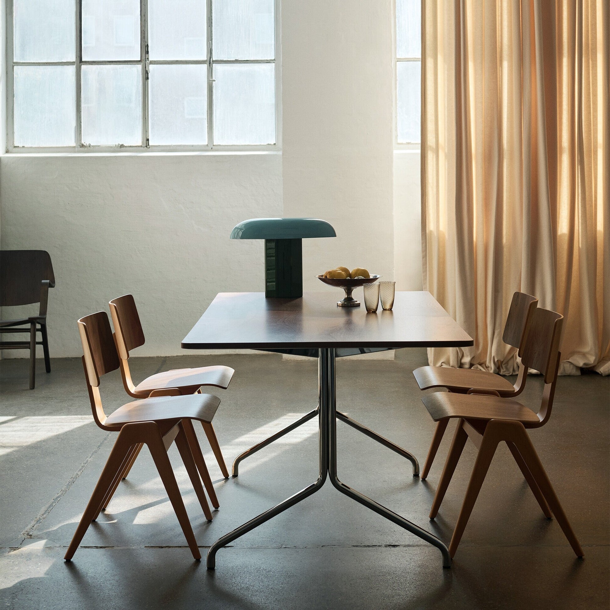 Ein breites Stuhlgestell mit ausgestellten Beinen trifft auf eine gerundete Rückenlehne, die auf einem schmalen vertikalen Verbindungsstück thront. Die komplexe Konstruktion ist eine Hommage an das Handwerk, während der funktionale Nutzen als stapelbarer Stuhl in ein visuell schlichtes Design übersetzt wird. Das massive Stuhlgestell aus hochwertigem Buchenholz, das nach den Standards der FSC®-Zertifizierung hergestellt wurde, verleiht dem Stuhl einen stabilen Stand, während die Sitzfläche und die Rückenlehne leicht und reduziert wirken.