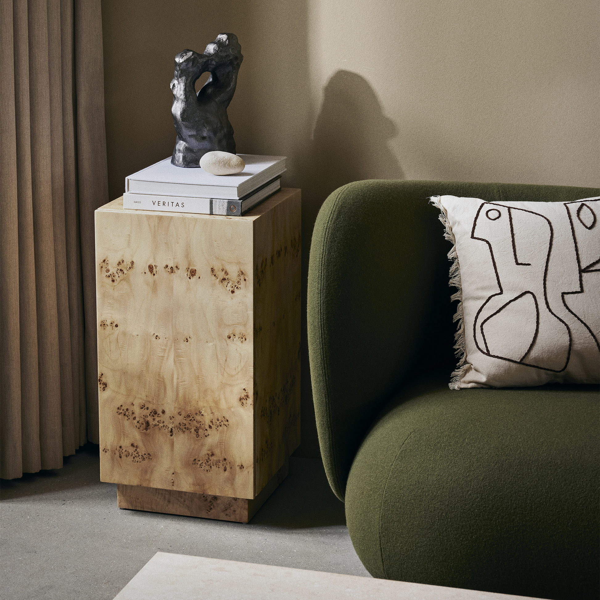 Mit seinen strengen, geraden Linien strahlt der Burl Beistelltisch eine kraftvolle Ästhetik aus. Der Tisch besteht aus FSC®-zertifiziertem Holz, das detailreich gemasert wurde und eine einzigartige Textur aufweist. Das natürliche Wärme des Holzes verleiht dem Raum eine einzigartige Atmosphäre. Der rechteckige Korpus steht vertikal auf einem quadratischen Podest und erinnert an einen Ausstellungssockel für Skulpturen.