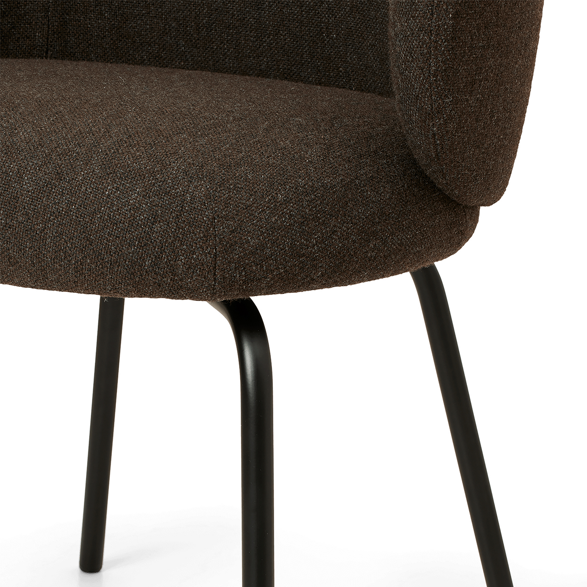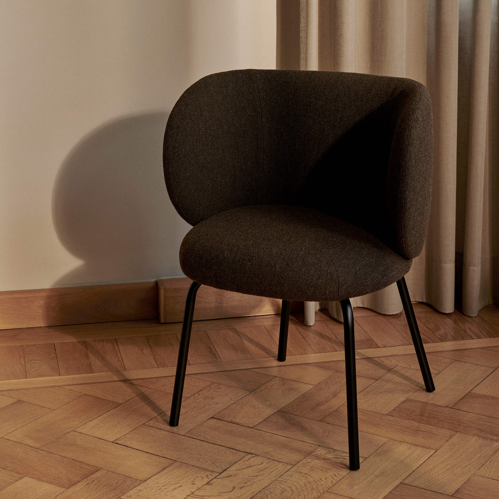 Der Esszimmerstuhl zeichnet sich durch seine elegante Schlichtheit aus, die von der hohen Polsterung und den stark abgerundeten Kanten geprägt ist. Der schlanke, geradlinige Unterbau verleiht dem Stuhl eine robuste Stabilität, während die vier ausgestellten Beine aus pulverbeschichtetem Stahlrohr für einen festen Stand sorgen.