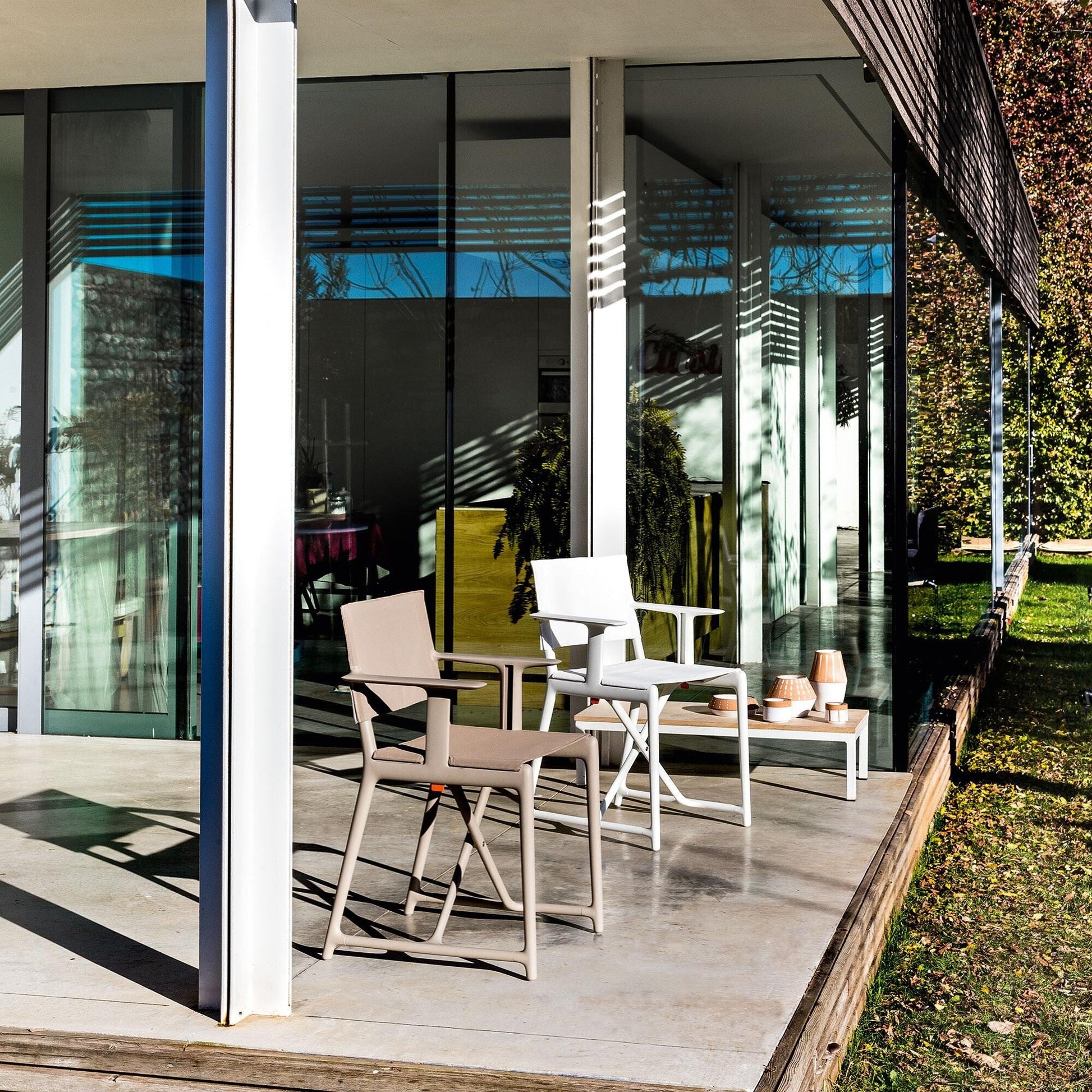 Der Stanley Klappstuhl für den Außenbereich ist eine Hommage an die traditionsreichen Regiestühle aus großen Hollywood-Filmen. Mit seiner einzigartigen Form lässt er sich platzsparend zusammenklappen, wie diese berühmten Stühle. Das sanft gerundete Gestell wurde aus witterungsbeständigem, mit Glasfasern verstärktem Polypropylen gefertigt, während Sitz und Rückenlehnen aus einem fein gewirkten PVC-Gewebe bestehen. Der Stanley Klappstuhl ist in drei Farbvarianten erhältlich.