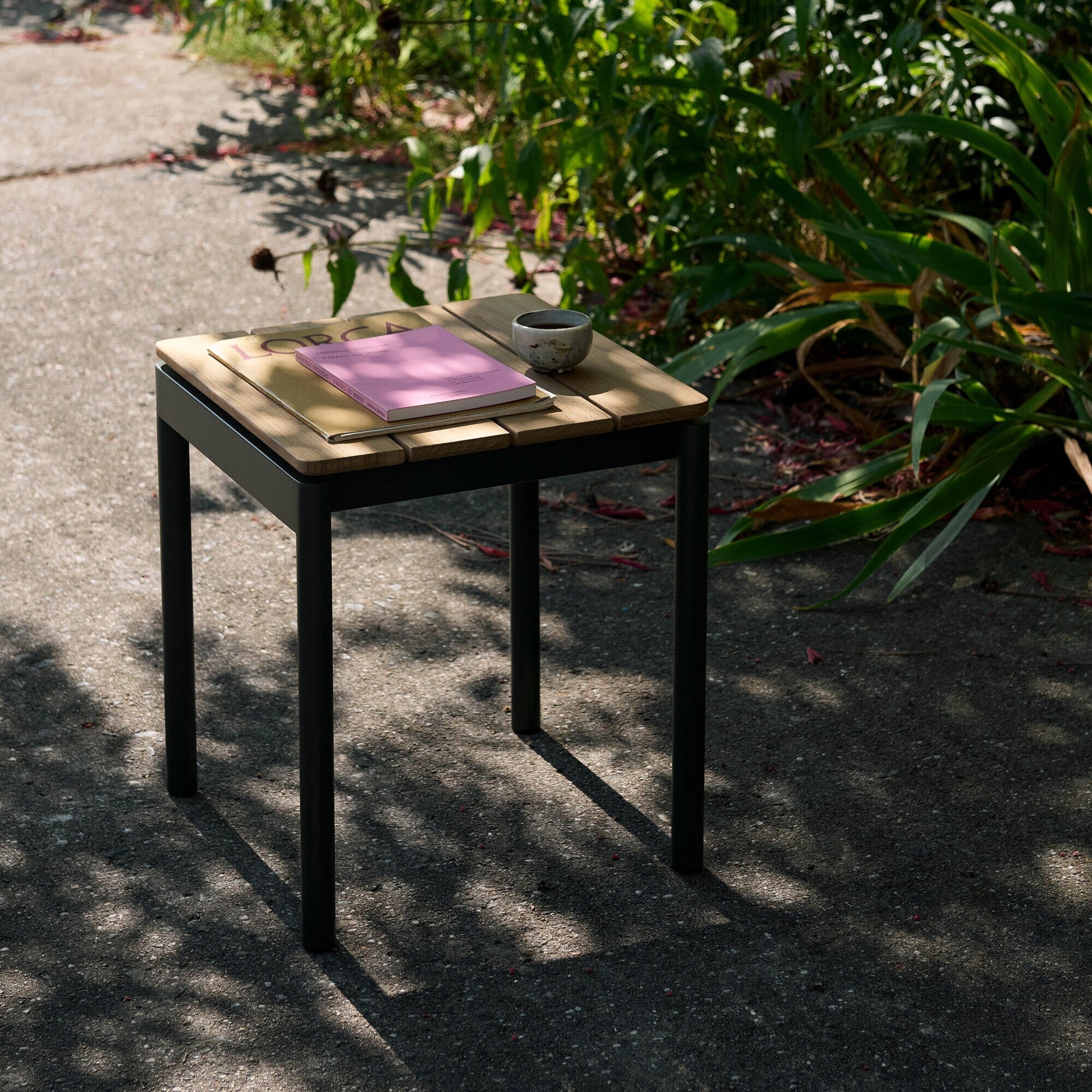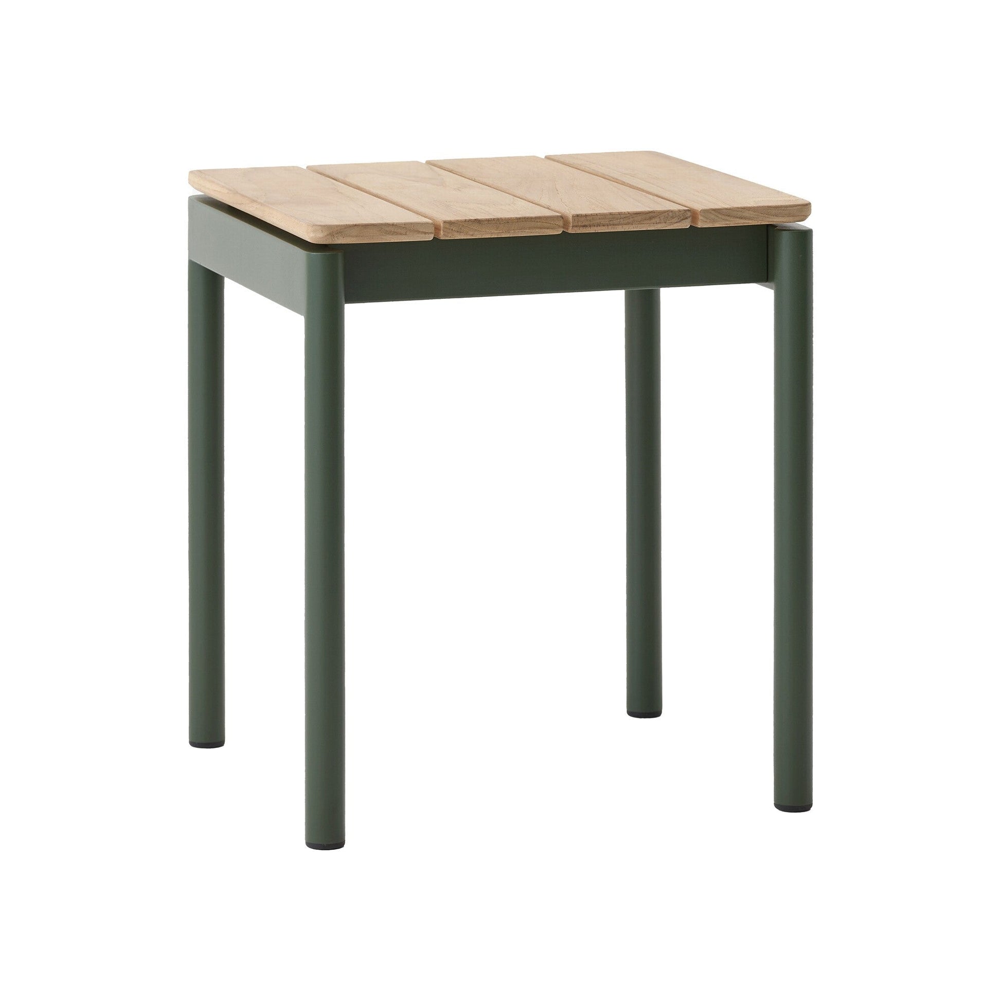 Die Sitzfläche besteht aus hochwertigem, FSC-zertifiziertem Teakholz, das für seine Haltbarkeit und seine natürliche Schönheit bekannt ist. Die breiten, sanft abgerundeten Latten unterstreichen die handwerkliche Qualität und verleihen dem Hocker eine warme, einladende Atmosphäre. Die Holzoberfläche kann entweder unbehandelt bleiben, um eine natürliche Patina zu entwickeln, oder mit Öl gepflegt werden, um ihren ursprünglichen Farbton zu bewahren.