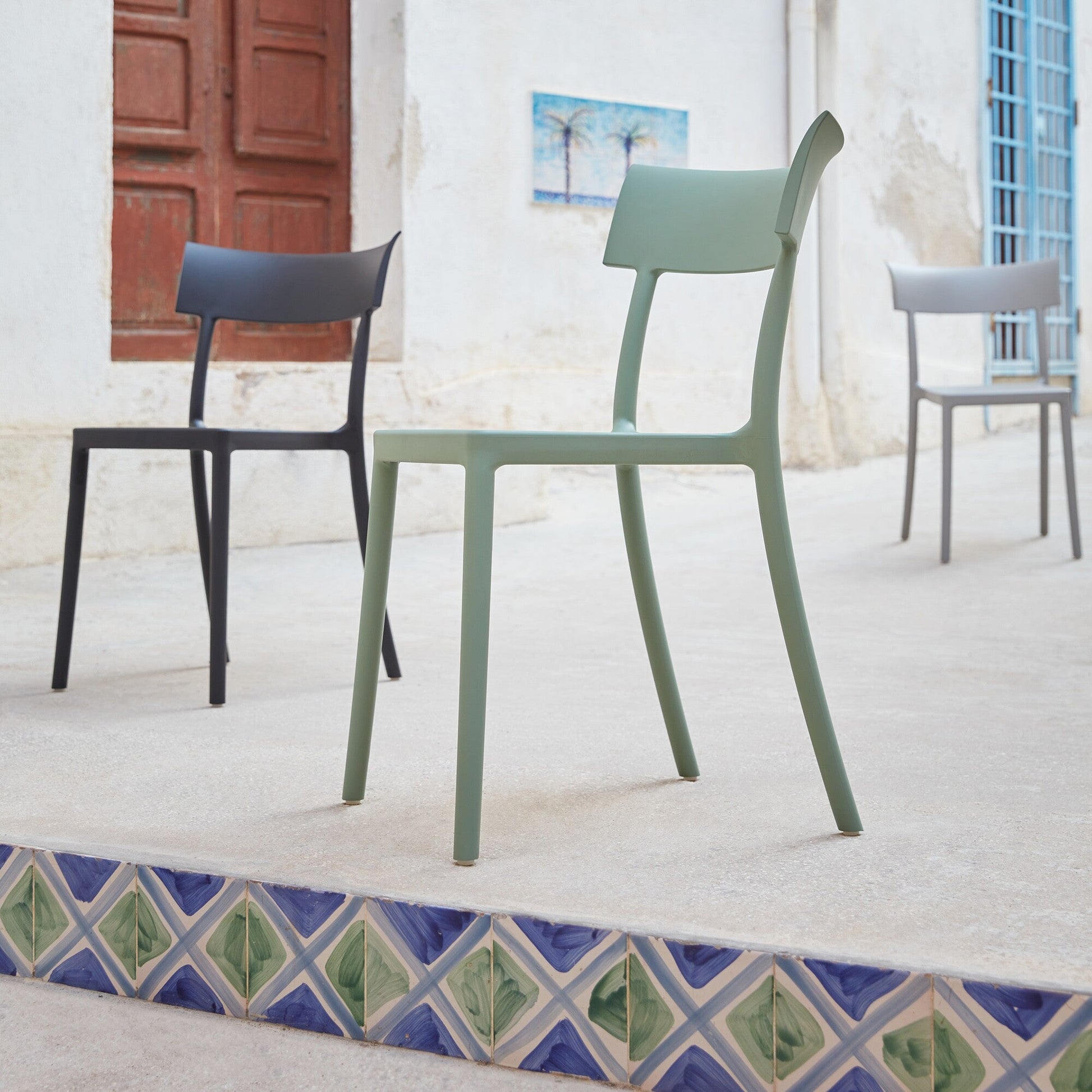 Mit seiner klaren Formensprache und der gebogenen, rechteckig geschnittenen Rückenlehne schafft der Catwalk Stuhl matt einen ansprechenden Kontrast zur annähernd quadratischen Sitzfläche. Der Stuhl ist aus thermoplastischem Technopolymer gefertigt, einem nachhaltigen Werkstoff, der aus recyceltem Kunststoff hergestellt wird. Der mineralische Füllstoff macht ihn robust und langlebig, sodass er auch im Freien bei schlechtem Wetter verbleiben kann.