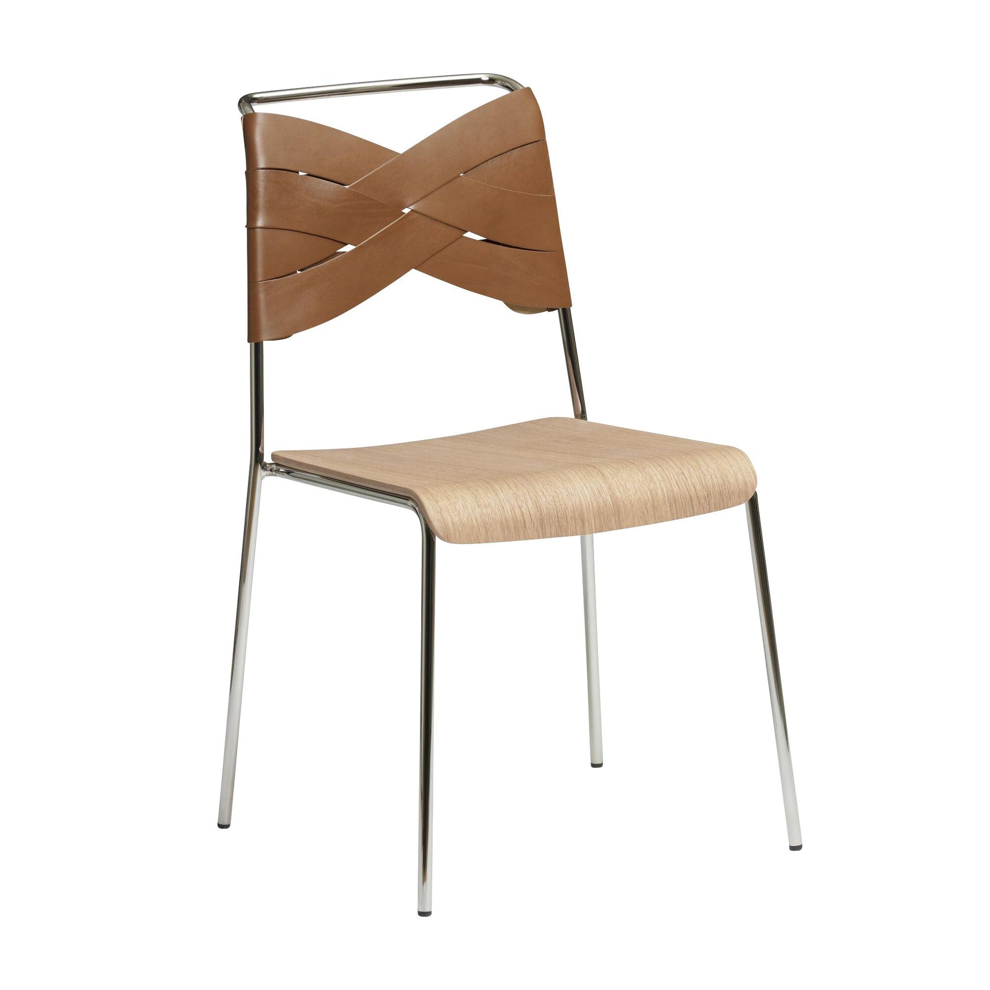 Ausführungen: Torso Stuhl / Rückenlehne Leder cognac/Sitzfläche Eiche Natur/BxHxT 52x83x55cm/Gestell Stahl verchromt
