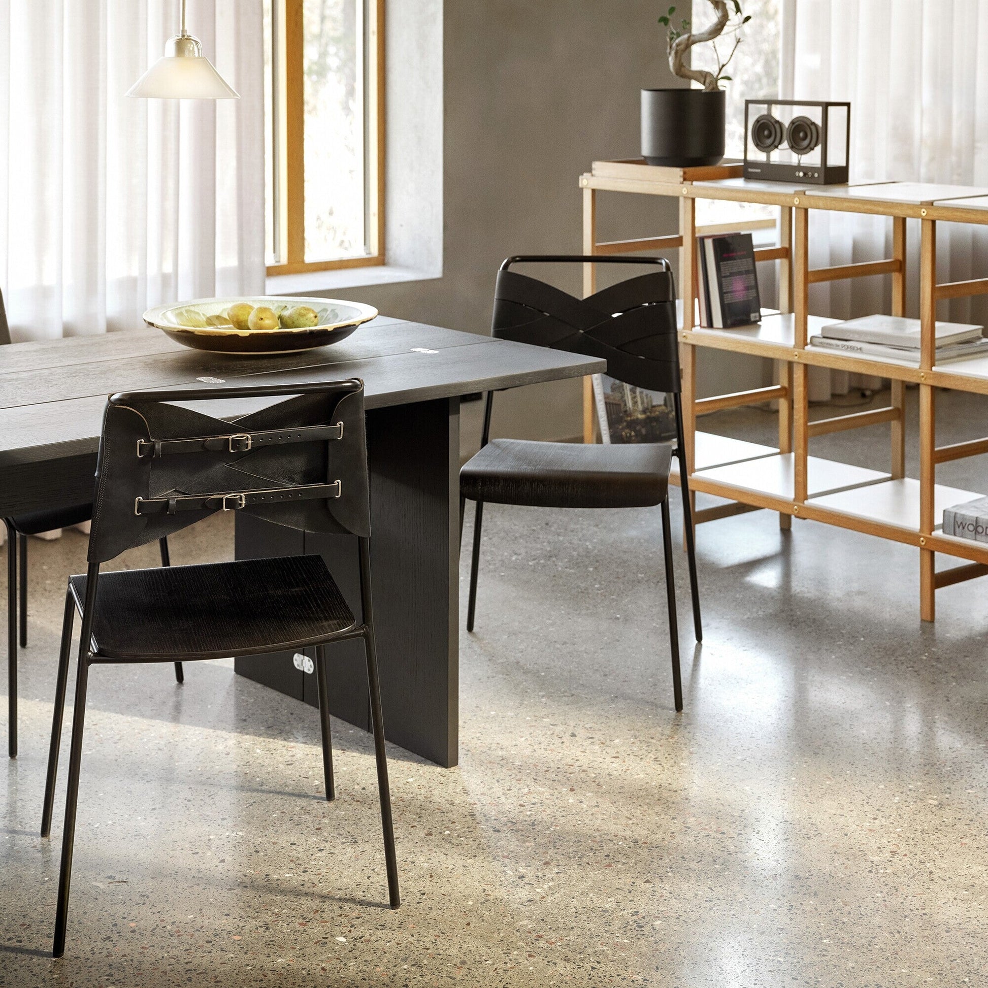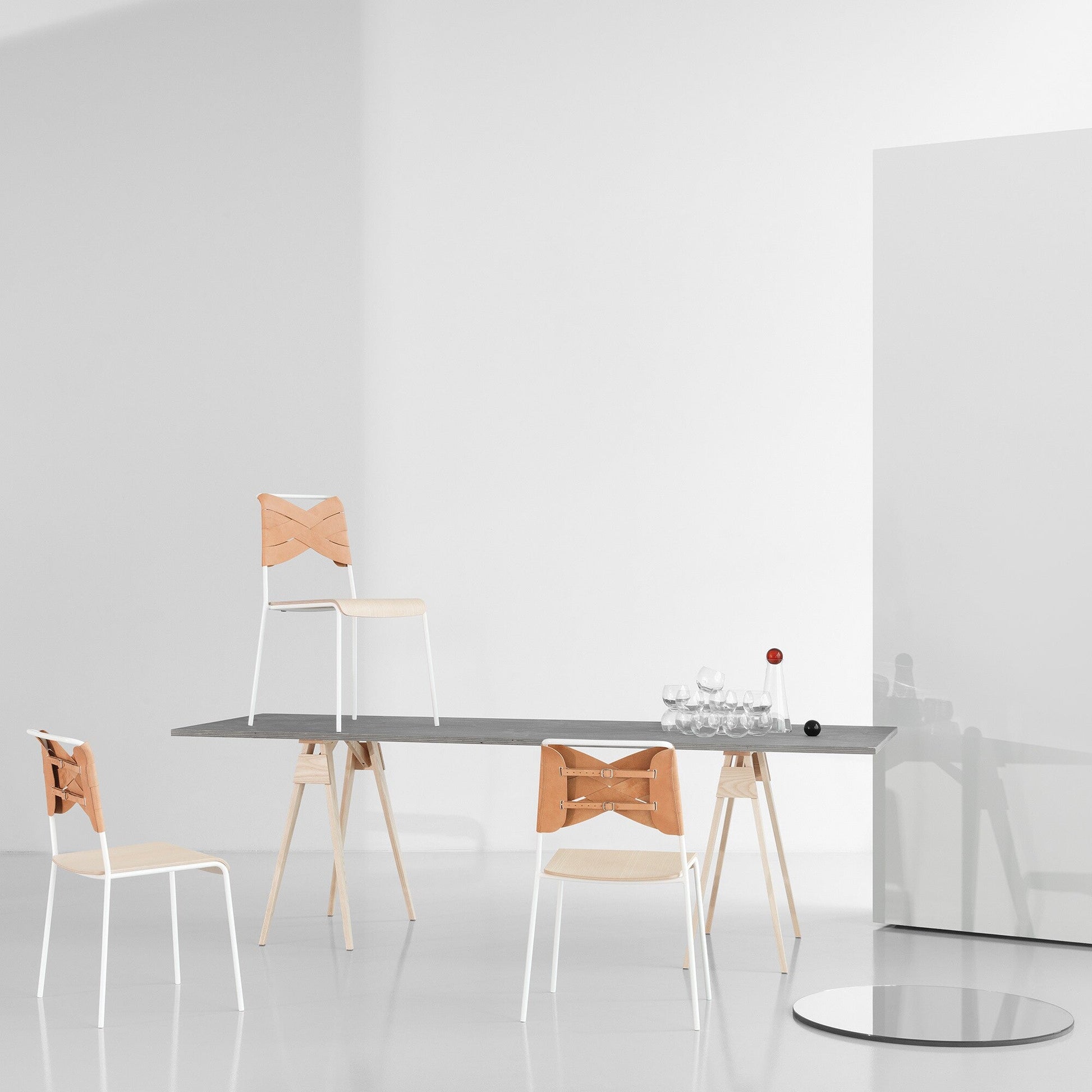 Mit dem Torso Stuhl wollte Hillard ein Möbelstück entwerfen, das Menschen tiefgreifende Emotionen einflößt. Inspiriert von einem menschlichen Torso, der mit verschiedenen Kleidungsstücken angezogen wird, variierte sie auch bei dem Stuhl mit verschiedenen Mustern und Materialien. Das Gestell aus pulverbeschichtetem Stahl bildet den Körper des Stuhls, während die leicht ausgestellten vier Beine einen festen Stand garantieren. Die Rückenlehne, gefertigt aus hochwertigen Lederstreifen, bildet einen optischen Blickfang und erinnert an eine Masche. Die Sitzfläche aus furniertem Holz bietet einen nüchternen Kontrast dazu.