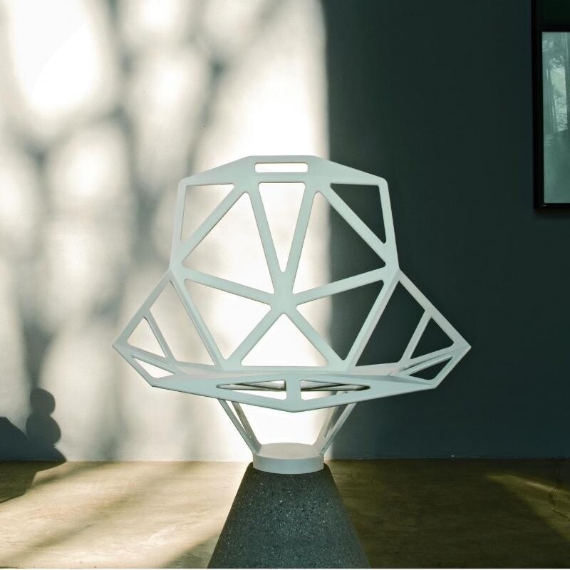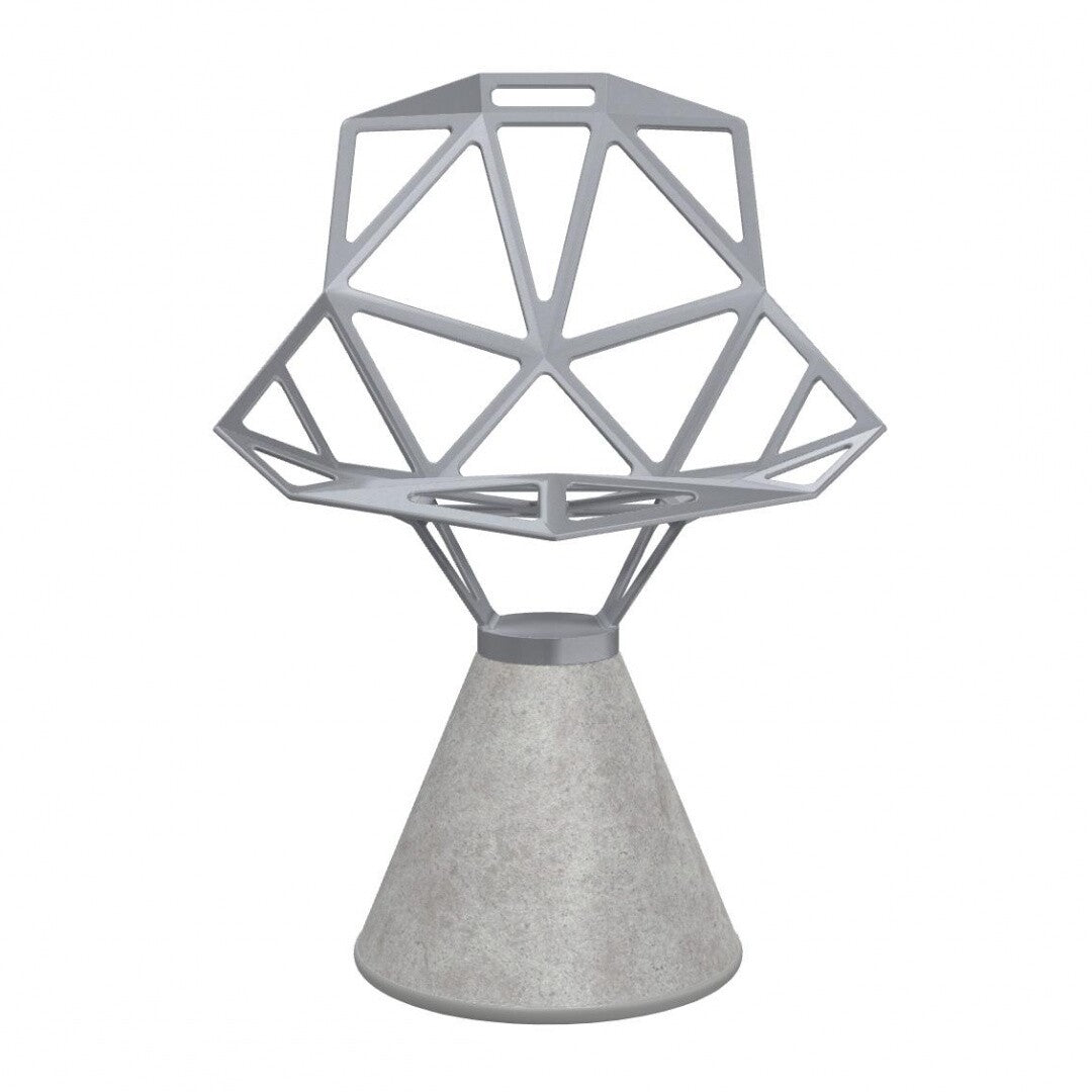 Das Markenzeichen des Chair One Stuhls Zementfuß ist der Standfuß aus Zement, der eine konische Form hat und dem Stuhl einen festen Stand gewährleistet. Dies kontrastiert interessant mit der Sitzschale aus Aluminium, die in einem speziellen Druckgussverfahren geformt wurde und aus geraden Streben besteht, die ein geometrisches Muster bilden.