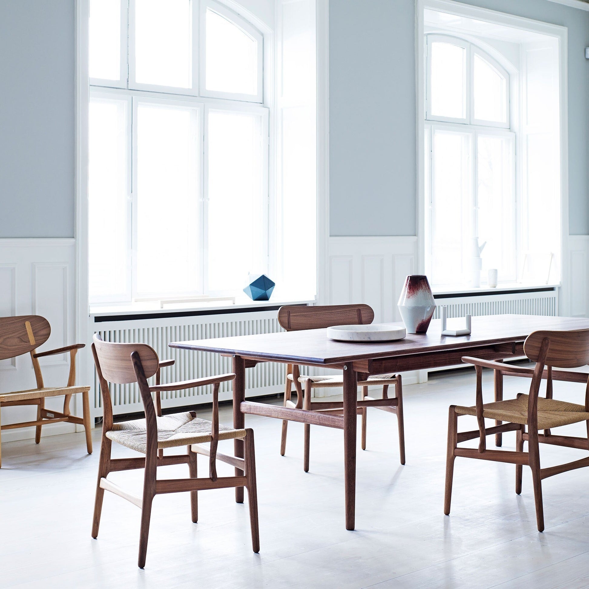 Mit seiner raffinierten Gestaltung lädt der CH26 Armlehnstuhl zu längerem Verweilen am Tisch ein. Die organischen Formen gepaart mit der raffinierten Rückenlehne und dem handgewebten Sitz sind ein wahres Highlight in jeder Wohnung und rücken die Stimmung Richtung Lounge.