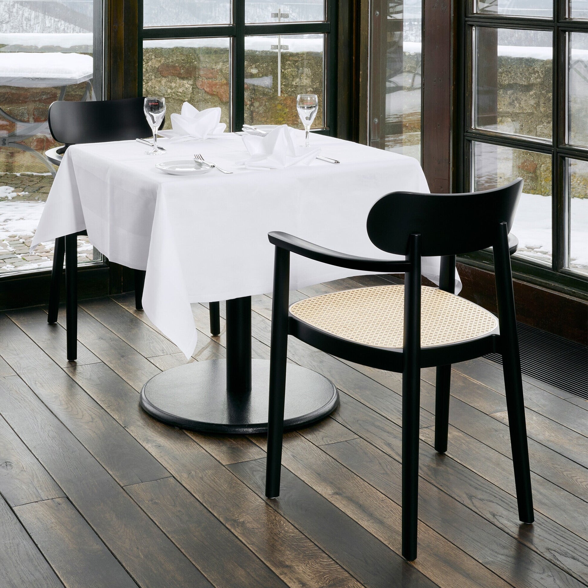 Der 118 FV Armlehnstuhl mit Rohrgeflecht misst 57cm in der Breite, 52cm in der Tiefe und 80cm in der Höhe. Seine Sitzhöhe beträgt 46cm. Passend dazu sind weitere Stühle oder Hocker aus der Serie Thonet 118 erhältlich.
