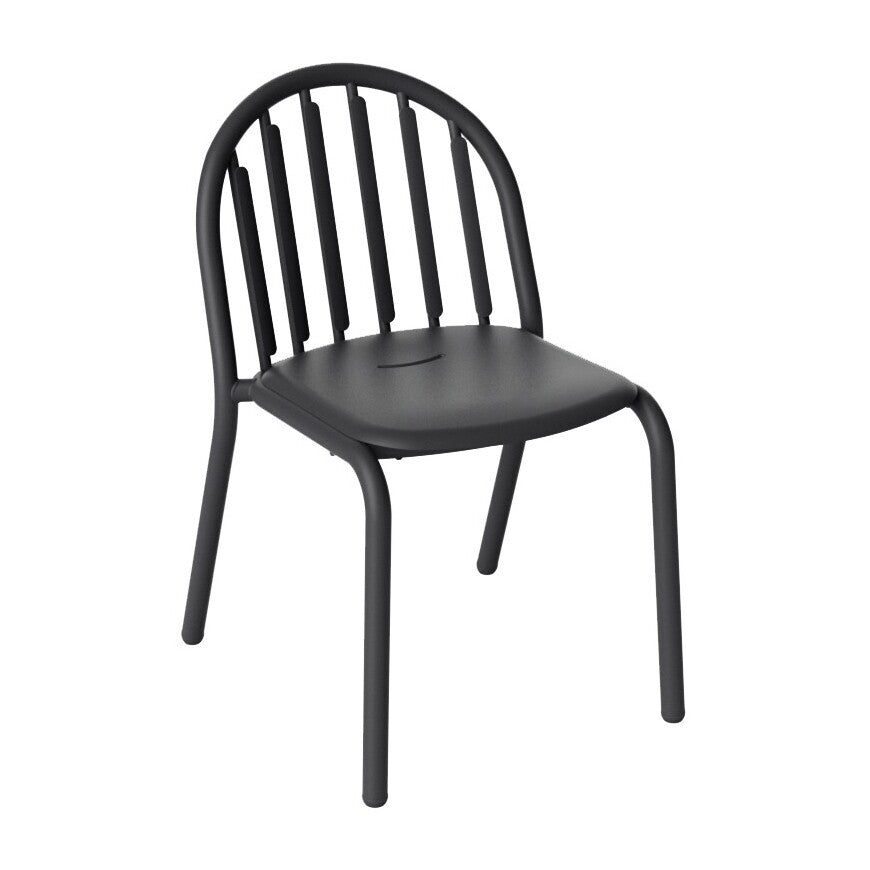 Der Stuhl fasziniert durch seine geschwungene und spielerische Formgebung, die vier leicht ausgestellten Beine auf eine elegante Basis reduziert. Diese wird nahtlos in den Rahmen der bogenförmigen Rückenlehne übergeht, die aus sechs schmalen Streben besteht und leicht nach hinten geneigt ist. Die Sitzfläche ist ebenfalls leicht geschwungen und bietet durch die schmale Aussparung einen schnellen Abfluss von Regenwasser.