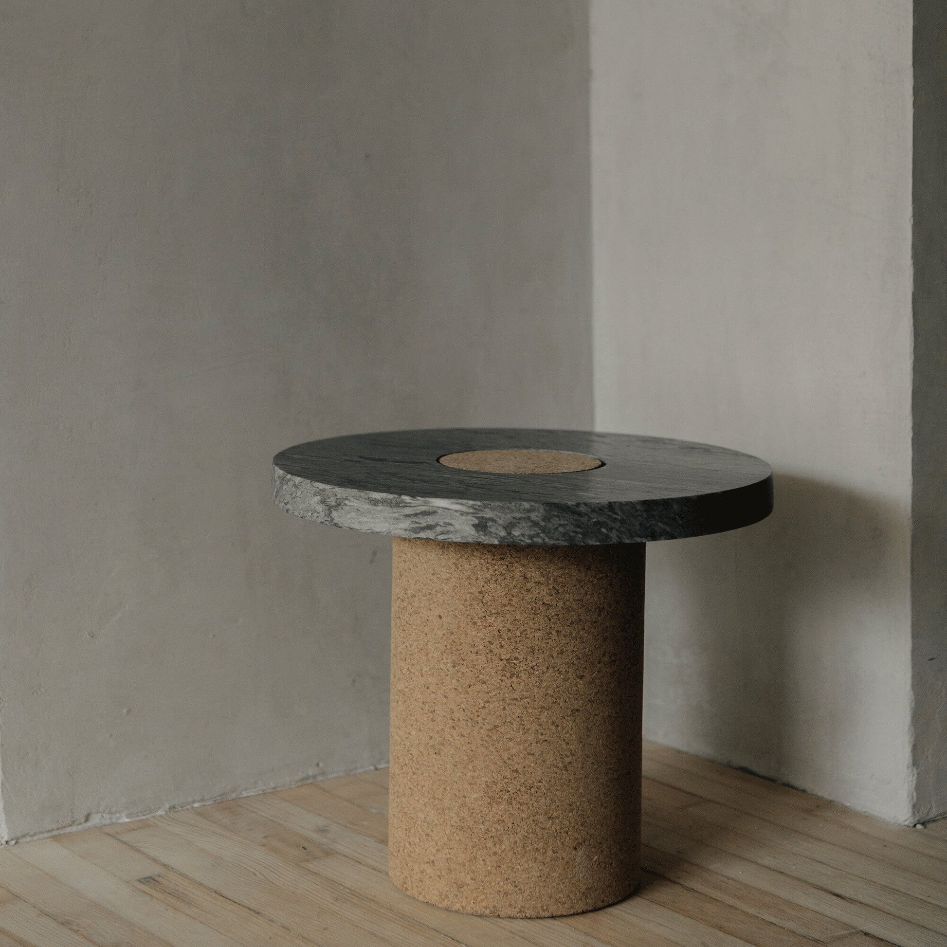 Das Design des Sintra S Beistelltisches ist geprägt von Einfachheit und Klasse. Der massive Zylinder des Tischfußes trägt die runde Tischplatte, die von einem Kreis mittig durchbrochen ist. Dieser innovative Entwurf schafft nicht nur eine einzigartige Optik, sondern auch eine praktische Funktion, da sowohl Kork als auch Marmor auf der Tischoberseite zu sehen sind.