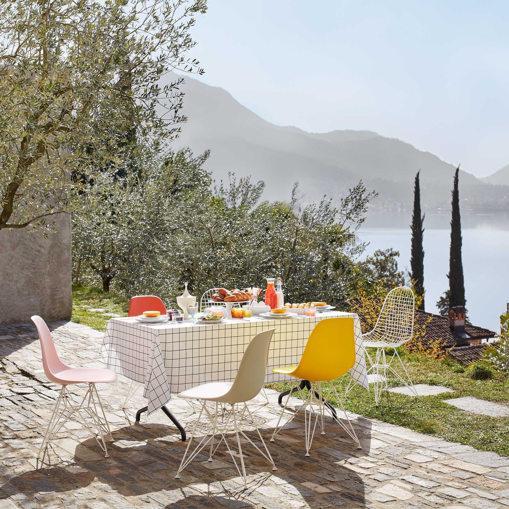 Einzigartig ist das markante Untergestell des Eames Plastic Side Chair DSR Gestell weiß, auch bekannt als Eiffelturm-Gestell, das durch die vielfach miteinander verbundenen Stäbe einen stabilen Stand garantiert. Die filigrane Konstruktion aus weiß beschichtetem Stahldraht wirkt trotz ihrer Leichtigkeit sehr robust. Auf diesem Gestell liegt die großzügig dimensionierte Sitzschale aus durchgefärbtem Polypropylen, die in verschiedenen Farben erhältlich ist. Die ergonomisch ausgerichtete Form bietet eine etwas vertiefte Sitzfläche mit einem angenehmen seitlichen Halt. Die hochgezogene Rückenlehne sorgt gemeinsam mit der Sitzhöhe von 43 cm für perfekten Sitzkomfort. Als Zubehör stehen bequeme Sitzpolster zur Verfügung, um den Eames Plastic Side Chair DSR Gestell weiß zu einem ultimativen Wohnkomfort zu machen. Zum Schutz von empfindlichen Teppichböden können spezielle Filzgleiter verwendet werden.