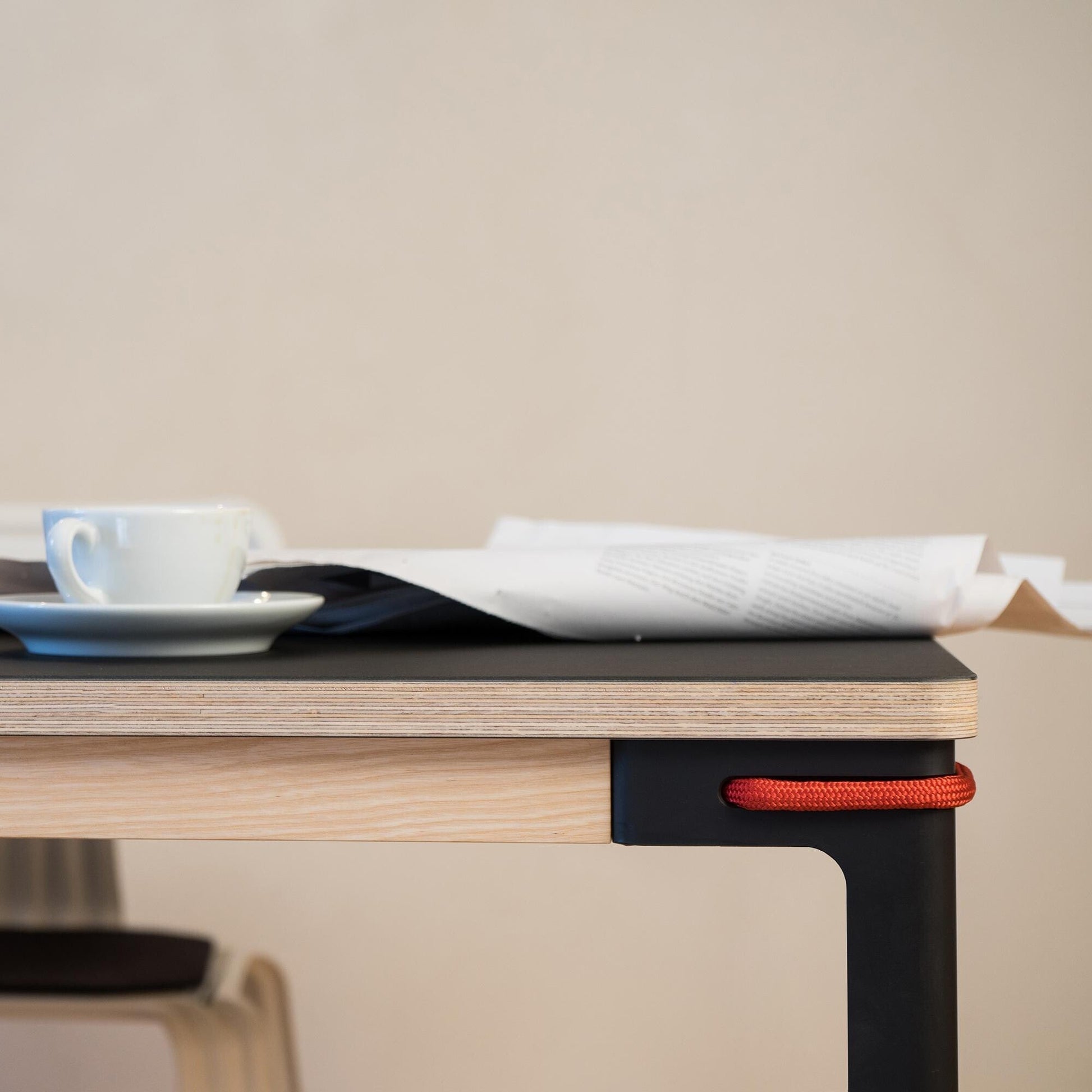 Ausführungen: Seiltänzer Tisch quadratisch 120x120cm / Linoleum schwarz/rotes Seil/Zarge esche/H 75cm/Gestell Stahl nitriert