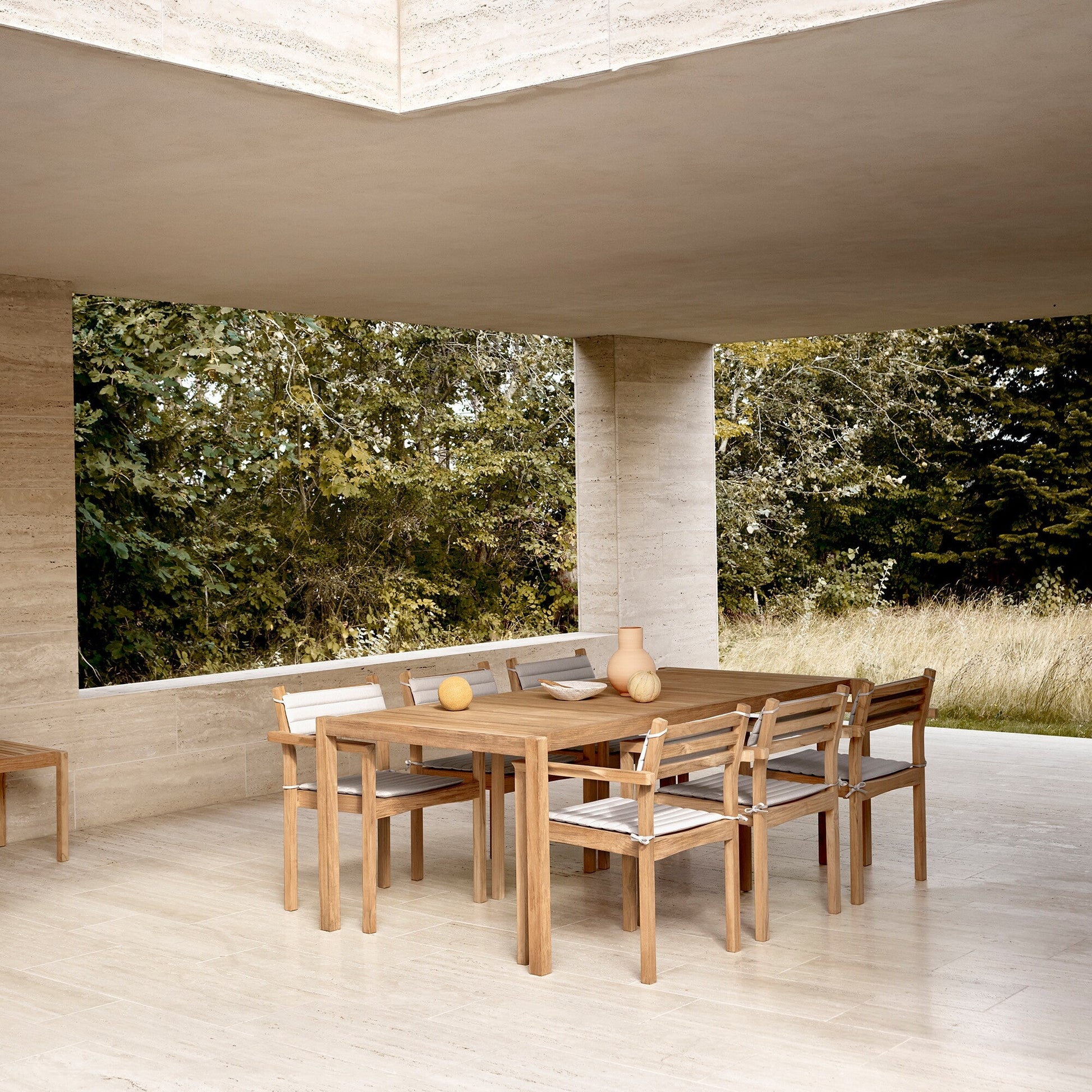 Mit seinem geradlinigen Rahmen, kantigen Beinen, auffälligem Knick in der Stuhllehne und unterbrochenen Rahmenfüllungen baut der AH502 Gartenarmlehnstuhl formal auf dem Gartenstuhl der Serie auf. Die einfache Form ist zurückhaltend modern, während die sanft eingebuchte Sitzfläche und die ergonomisch geformte Lehne einen edlen Eindruck erwecken und einen bequemen Sitz versprechen. Die großen Armlehnen erweitern das Sitzmöbel zum komfortablen Stuhl, der mit den passenden Kissen für Sitz und Lehne ausgestattet eine großzügige Sitzbasis für entspannte Stunden bietet.