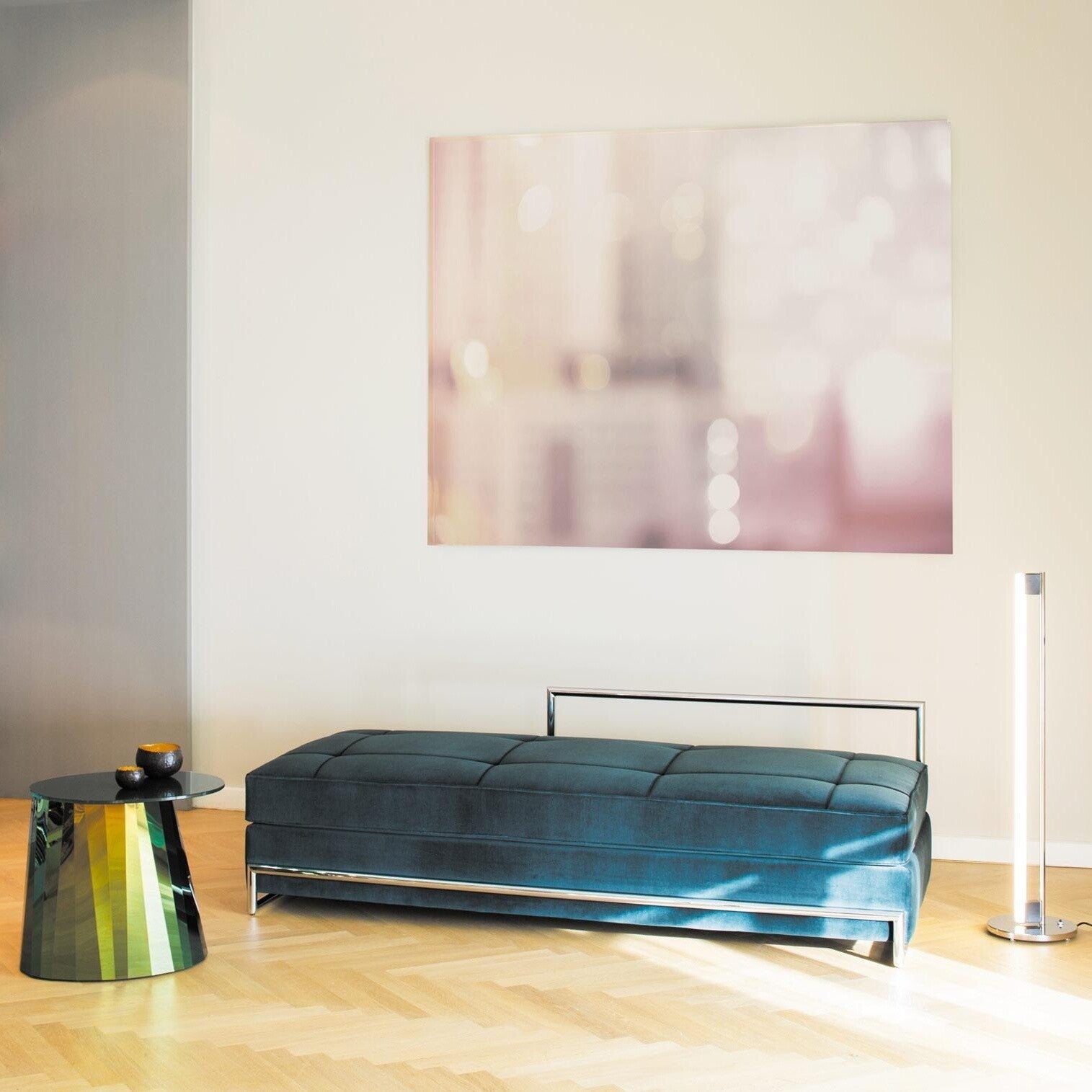 Das Gestell aus Edelstahl ist nicht nur robust, sondern auch verantwortlich für die Lichtbrechung, die das farbenfrohe Spektrum hervorruft. Das breite Farbspektrum bietet die Möglichkeit, einen Farbpunkt in die Wohnung zu setzen oder die elegante Einrichtung zu komplettieren. Die Abmessungen des Gestells betragen 42 cm in der breitesten Stelle, während die Glasplatte eine Länge von 56 cm erreicht.
