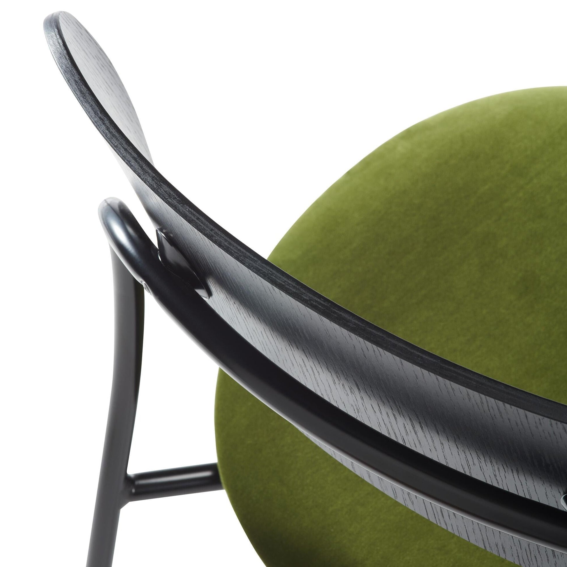Das Gestell des Pavilion AV3 Stuhls gepolstert besteht aus klassischen Rohren, die aus pulverbeschichtetem Stahl bestehen, während die Unterseite der vier Beine mit Gleitern aus Kunststoff versehen sind, die empfindliche Böden schützen. Die Sitzfläche und die Rückenlehne sind aus formgepresstem Eichenholzfurnier gefertigt, während die Sitzfläche mit edlen Materialien bespannt ist - entweder mit erlesenem Samt oder kühlem Leder.