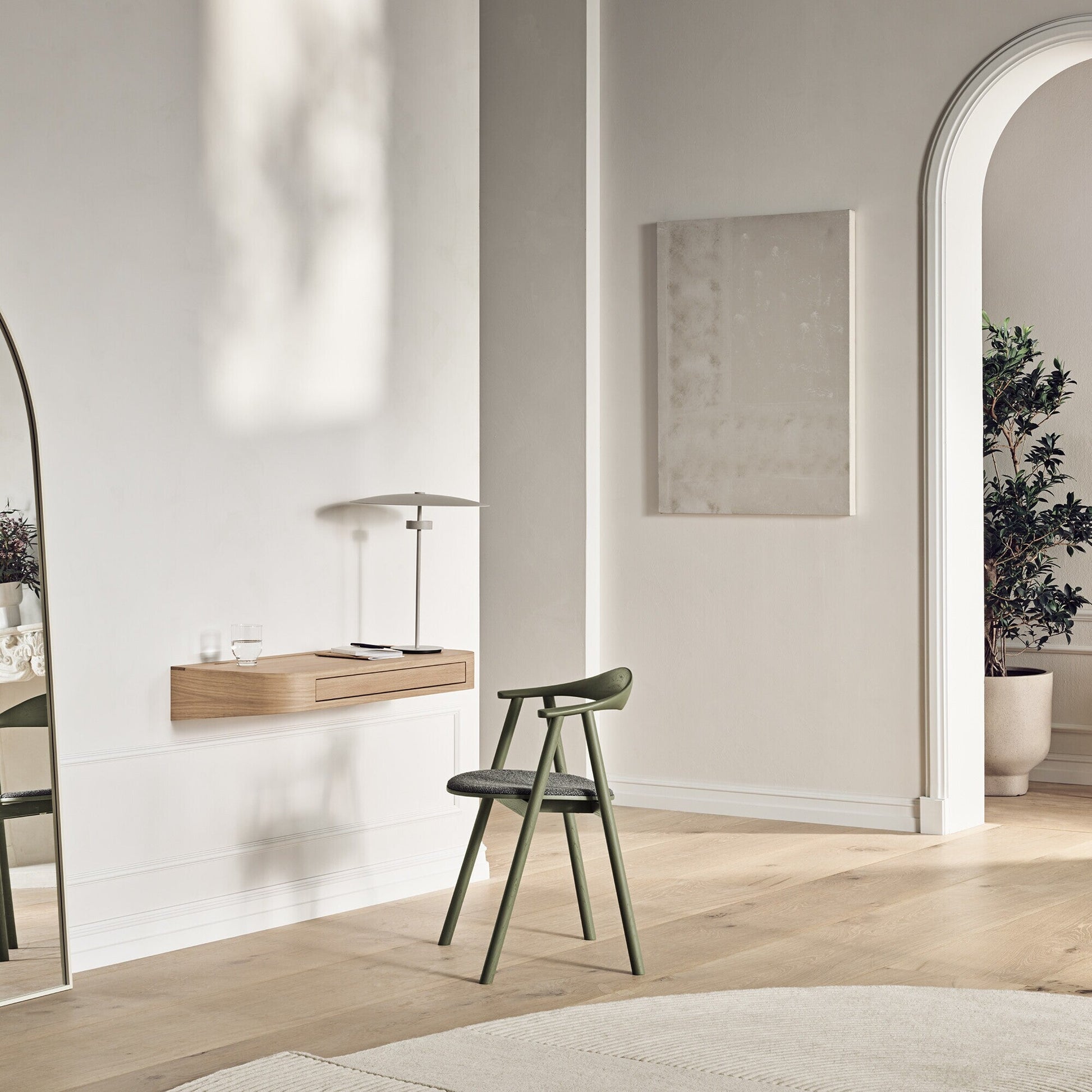 Der Vala Wandschreibtisch 90x40cm von Bolia ist ein Meisterwerk des Designers Martin Lauritsen. Mit seinen minimalistischen und geradlinigen Formen wirkt dieses elegante Wandmöbel wie ein stilvoller Akzent in jedem Raum. Die gebogene Form des Tischs, die gerade in die Wand übergeht, ist ein besonderes Detail, das den Wandtisch noch edler wirken lässt. Insbesondere an einer Wand, die ansonsten viel freien Platz hat, wirkt das Möbel wie ein inszeniertes Highlight der Einrichtung.