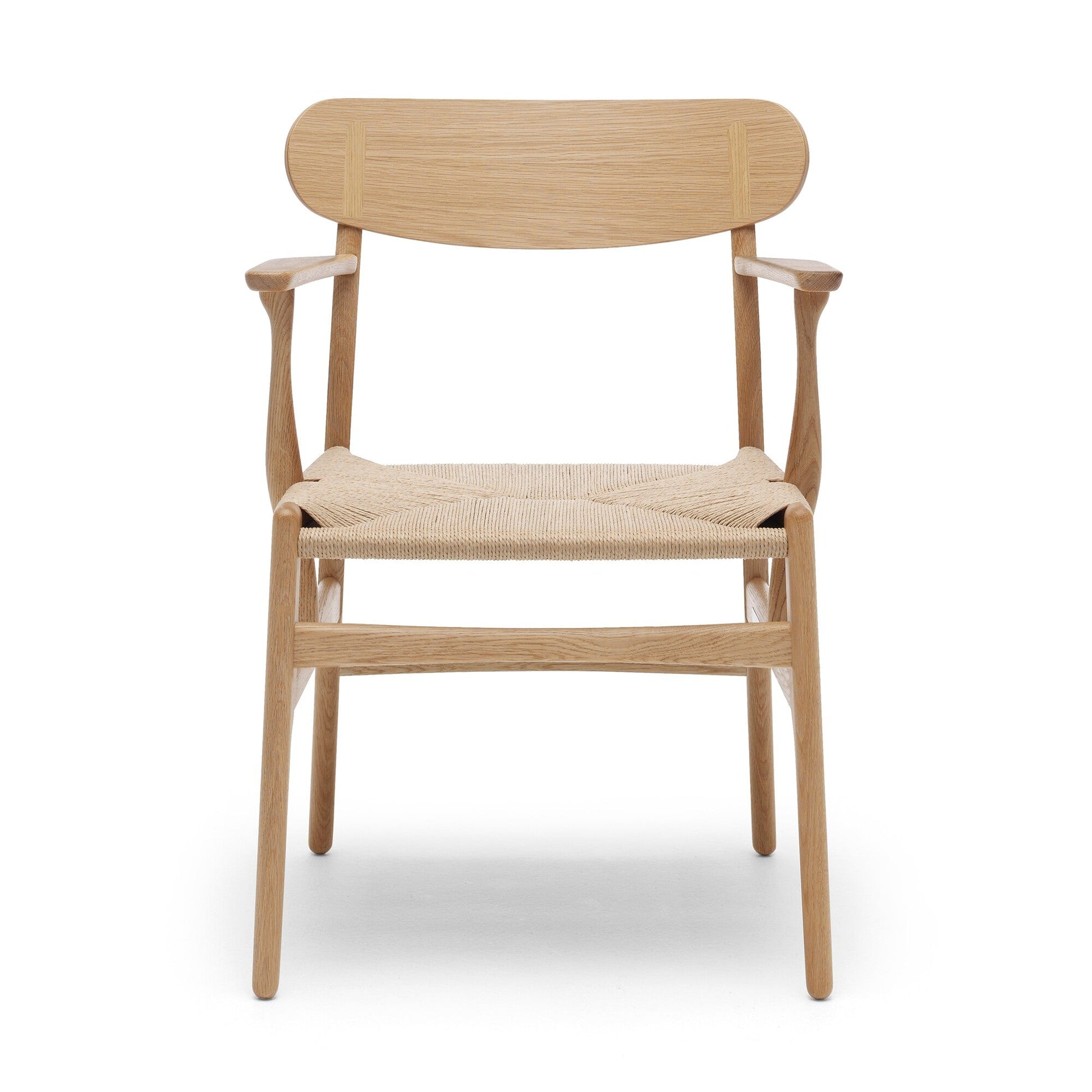 Mit seinem raffinierten Design lädt der CH26 Armlehnstuhl zu längerem Verweilen am Tisch ein. Die organischen Formen gepaart mit der raffinierten Rückenlehne und dem handgewebten Sitz sind ein wahres Highlight in jeder Wohnung und rücken die Stimmung Richtung Lounge.