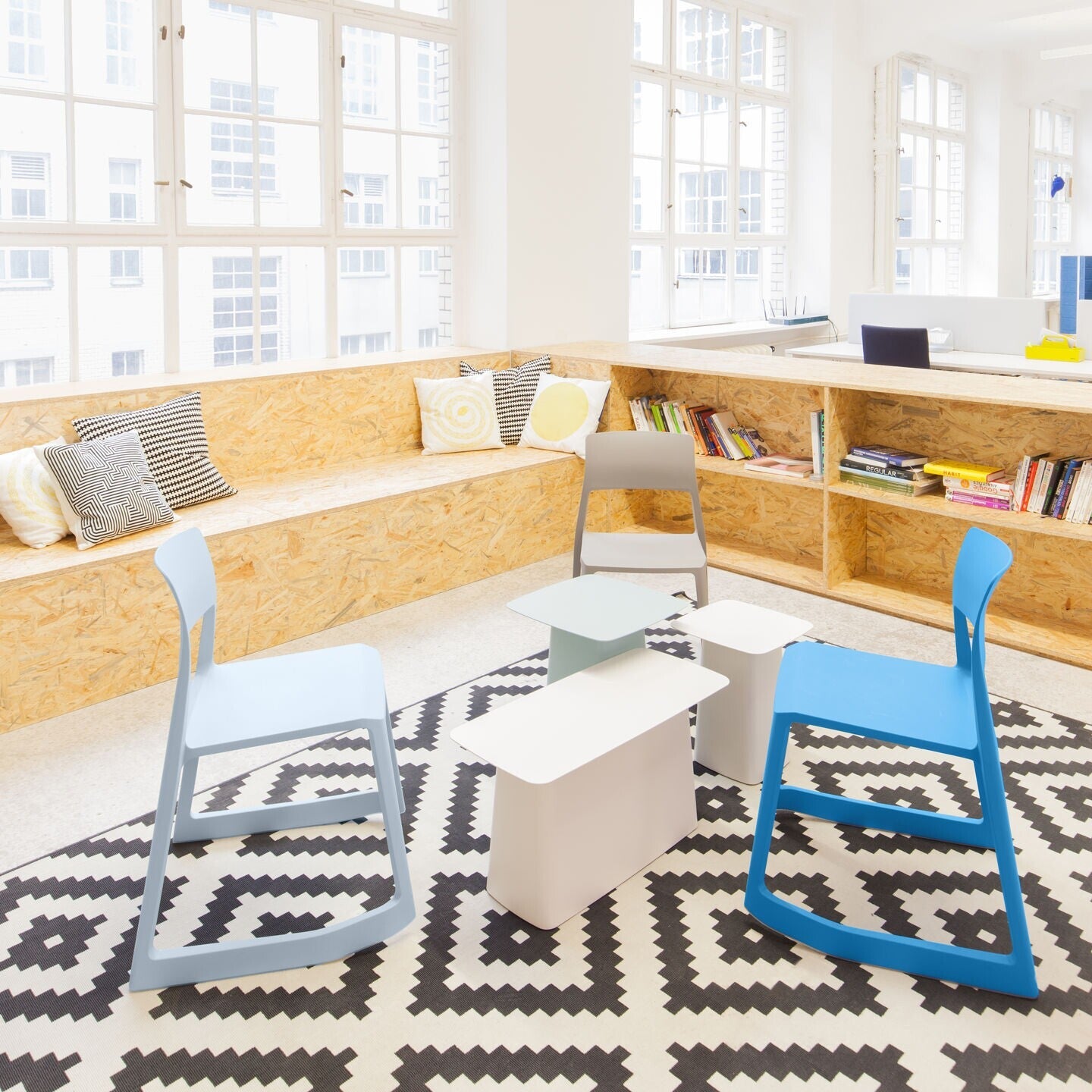 Mit seinen Abmessungen von 50,9cm Breite und 50,5cm Tiefe, sowie einer Höhe von 78,6cm, passt der Tip Ton Schaukelstuhl perfekt an den Ess- oder Küchentisch, ins Wohnzimmer, Kinder- und Jugendzimmer und findet zudem Platz im stylishen Designhotel, im Wartebereich einer Praxis, im Pausenraum eines kreativ gestalteten Büros oder in der Schule. Bis zu vier Modelle können platzsparend übereinandergestapelt werden. Der Designstuhl ist in verschiedenen Farben erhältlich.