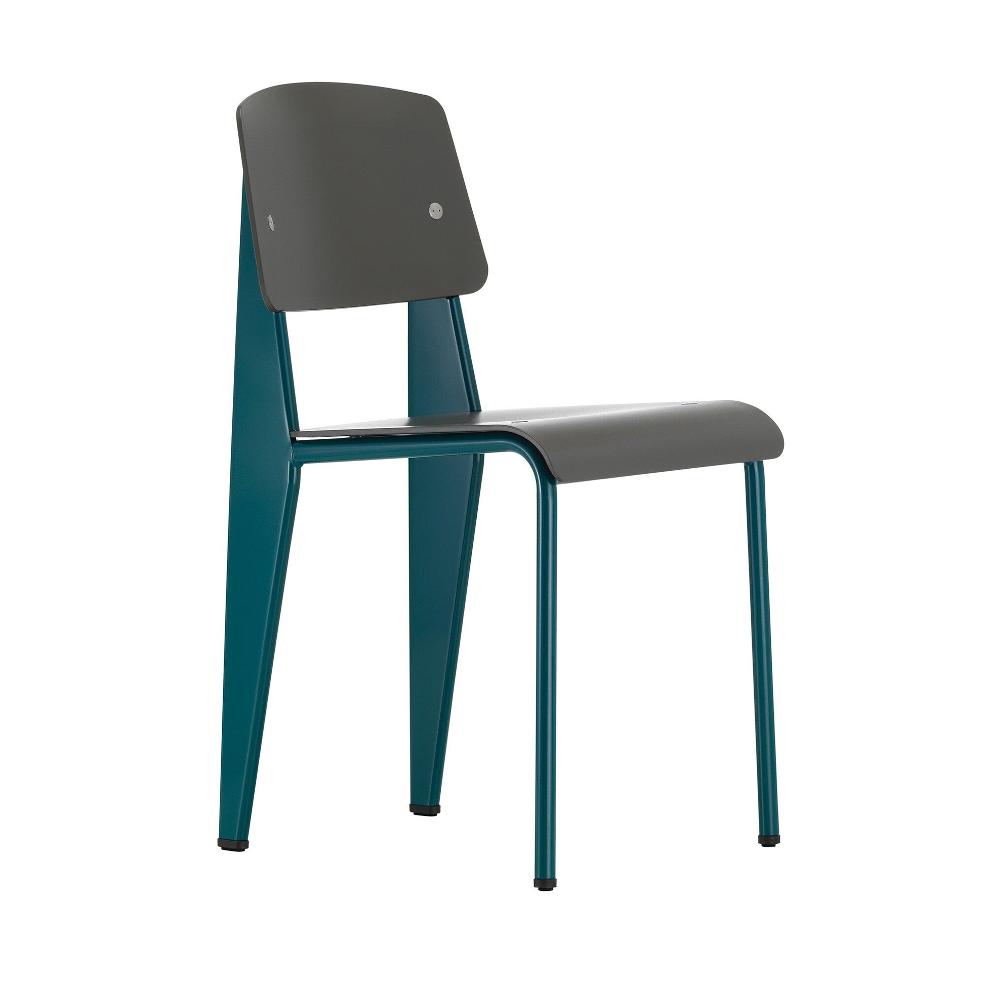 Einzigartig ist die schräg nach hinten geneigte Sitzfläche, die an der Vorderseite in einem Bogen nach unten gezogen ist. Dieses Detail ist ein Markenzeichen des Standard SP Prouvé Stuhls und unterstreicht die besondere Ästhetik dieses Möbelstücks.